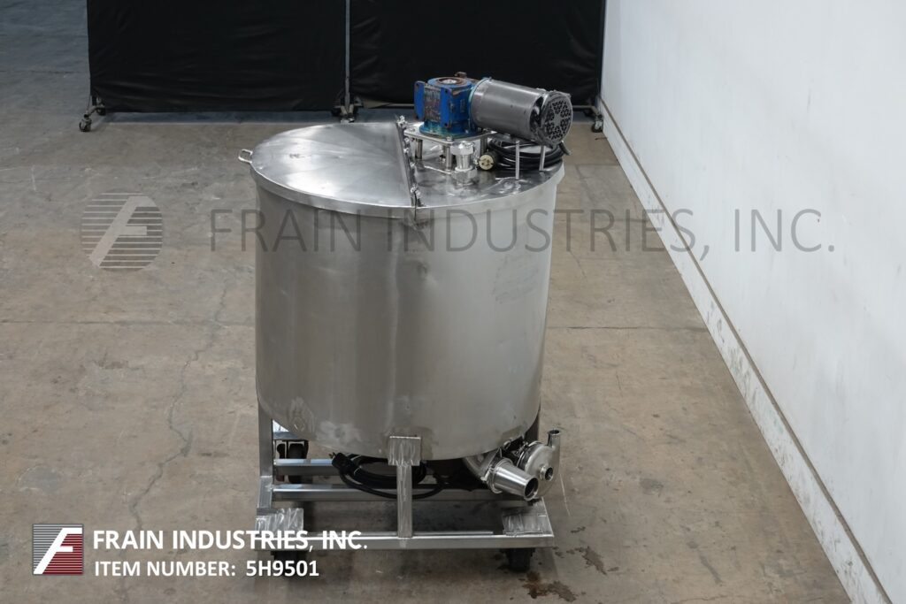 175 gallon, 304 stainless steel, skid mounted mixing tank with pump. Vessel dimensions: 40" diameter x 34" deep. Equipped with flip down lids, a 2 hp prop agitator, 3½"OD / 3"ID Tri-Clamp discharge and 3 hp centrifugal pump. Moutned on a stainless steel push cart.