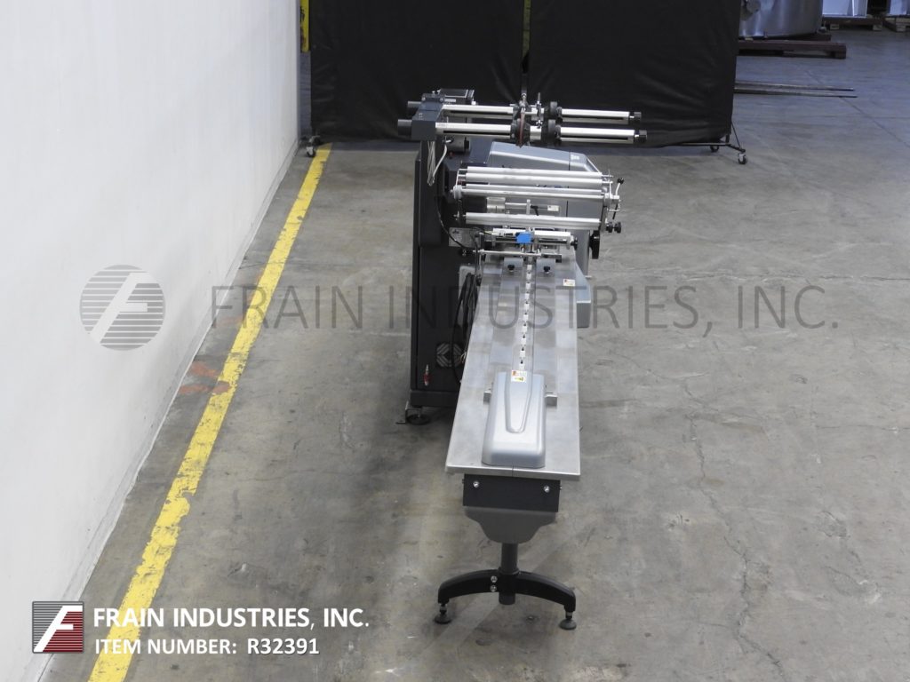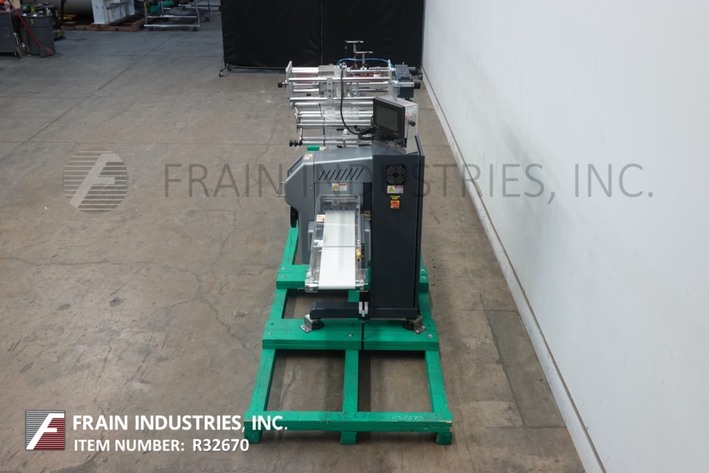 Pfm, Model Pearl, 2-up, automatic, 3 axis, servo driven, horizontal wrapper rated from 30 to 150 products per minute – depending on materials, application and machine configuration. Product size range: 1.6" to 18" in Length; 3/8" to 8.5" in Width; up to 3.9" in Height. Equipped with 60" long operator load area, lugged chain infeed, adjustable former, 2-up, 8.6" wide x 1" thick serrated seal jaws and fin seal assembly wheels with Interlock safety guarding and 42" long x 8" wide neophreme product discharge conveyor. Film spec’s up to 24" reel width; 14" OD reel, on 3" OD core. Control panel has PLC controls and touch pad controller with start, stop and e-stop push buttons. Mounted on base frame with (6) leveling legs.