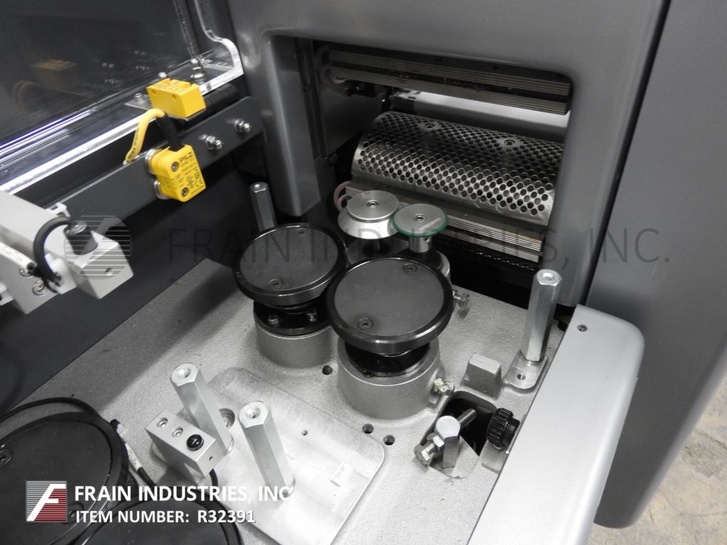 Pfm Model Pearl, 2-up, automatic, 3 axis, servo driven, horizontal wrapper rated from 30 to 150 products per minute – depending on materials, application and machine configuration. Product size range: 1.6" to 18" in Length; 3/8" to 8.5" in Width; up to 3.9" in Height. Equipped with 90" long operator load area, with 1½" high quick change plastic lugs currently set on 6" centers, adjustable former, 2-up, 8.6" wide x 1" thick serrated seal jaws and fin seal assembly wheels with Interlock safety guarding and 42" long x 8" wide neophreme product discharge conveyor. Film spec’s up to 24" reel width; 14" OD reel, on 3" OD core. Control panel has PLC controls and touch pad controller with start, stop and e-stop push buttons. Mounted on base frame with (6) leveling legs.