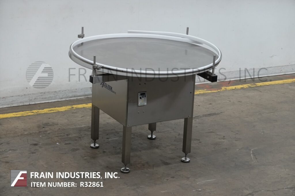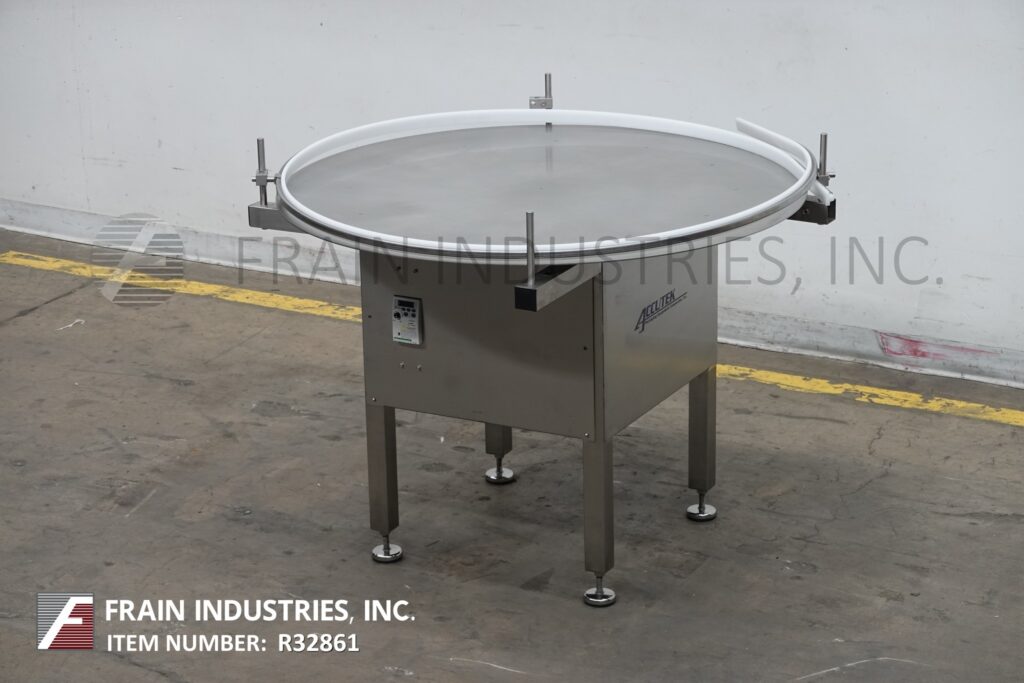 Accutek, 48"diameter, stainless steel, rotary disc accumulator with number of containers per minute – depending on materials, application and machine configuration. Equipped with stainless steel 48" disc with variable speed dial, adjustable side rails and a table height of 32" to 35".