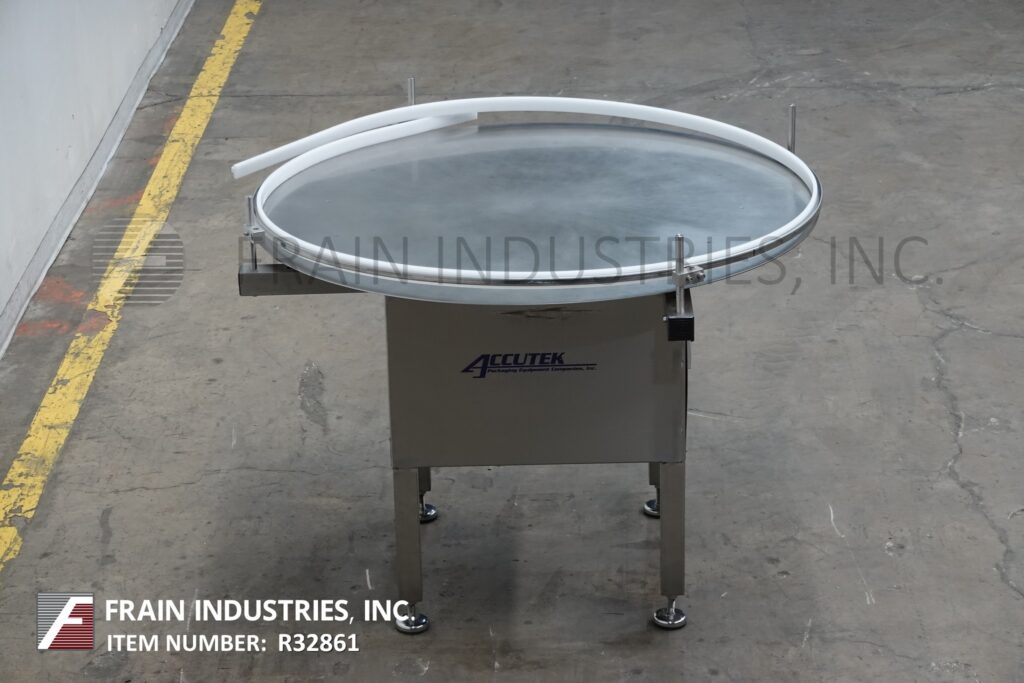 Accutek, 48" OD, stainless steel, rotary disc unscrambler with number of containers per minute – depending on materials, application and machine configuration. Equipped with stainless steel 48" OD disc with variable speed dial, adjustable side rails and table height of 32" to 35". Mounted on (4) leg height adjustable frame.