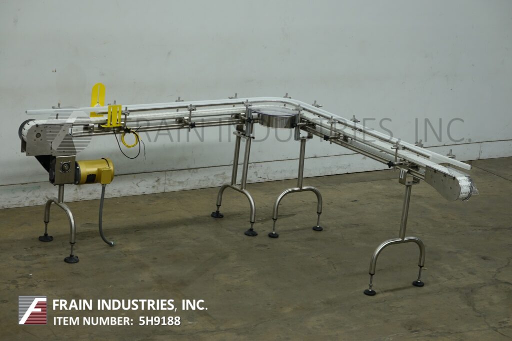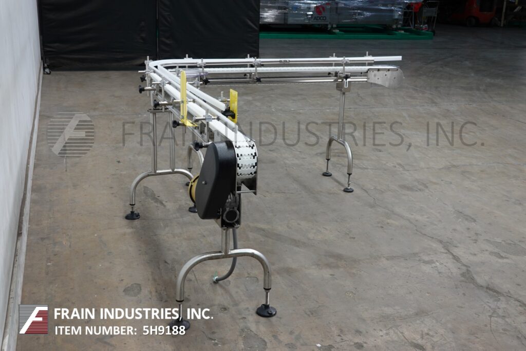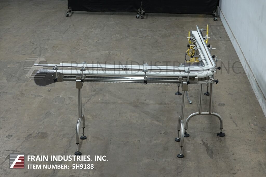 Autopak, 90° 3¼" wide x 156" long, stainless steel conveyor. Equipped with a 78" long infeed to 90° turn to a 78" long discharge with a 33" to 38" infeed / discharge height. Powered by a ½ hp drive.