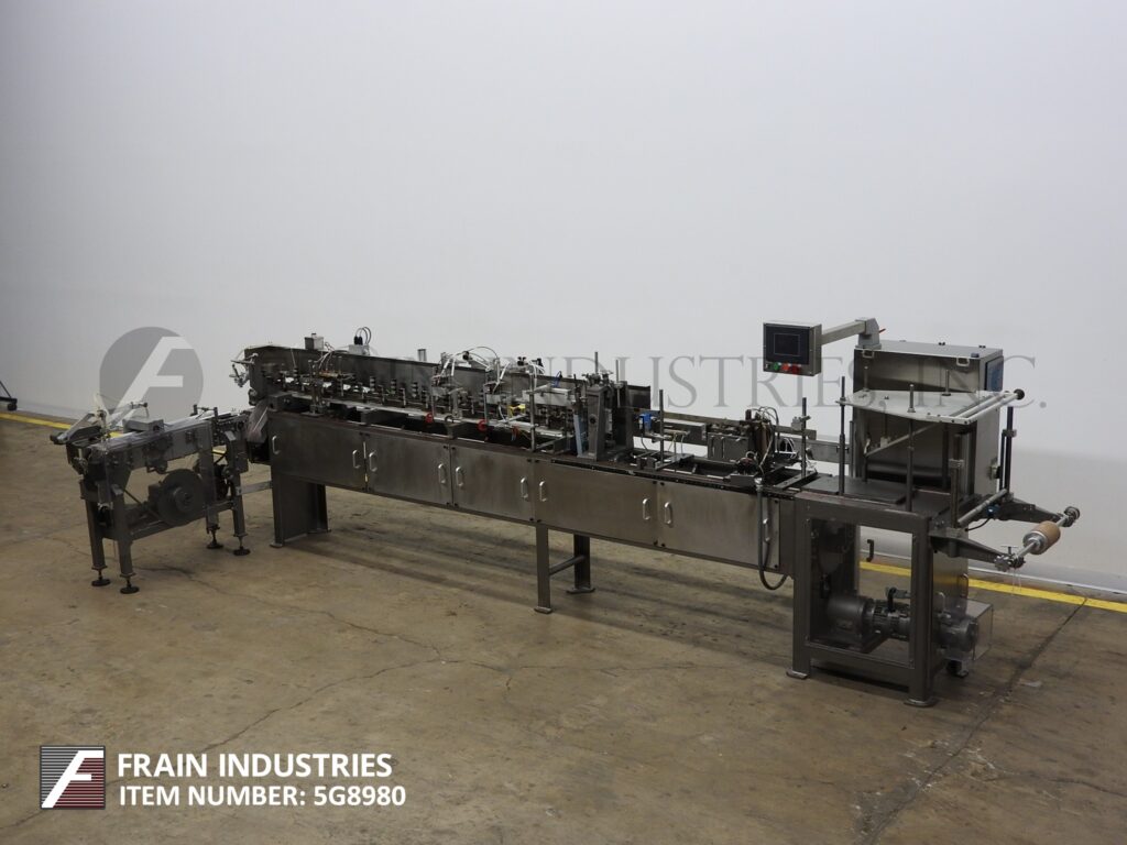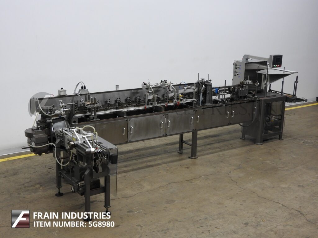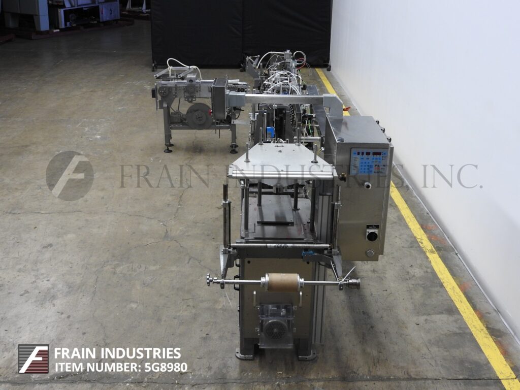 Bartelt Model IM712, Automatic, horizontal, mechanical driven, intermittent motion, form, fill, seal machine with single head auger filler rated from 12 to 80 pouches per minute – depending on materials and application. Pouch size range: 2" to 5-3/4" in Width; 2" to 9-1/2" in Length. Equipped with chain feed pouch conveyor and has 12 stations set on 7" centers, forming plow, with tension rollers, pouch side seal and cut-off stations, suction cup pouch opener, single head auger filler with controller, spinning wheel top pouch dust-off and heat seal bar with pouch pick-off station. 18" OD maximum film roll, with 20" maximum web width, on 1" OD core. Control panel has PLS controls with auger, start, run, jog, registration, top, bottom and side heat seal control switches with start, stop e-stop and web feed push button controls. Mounted on heavy duty frame with cage style safety guarding.