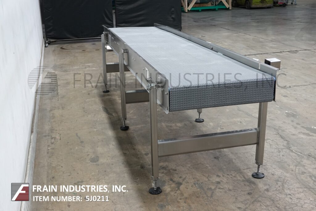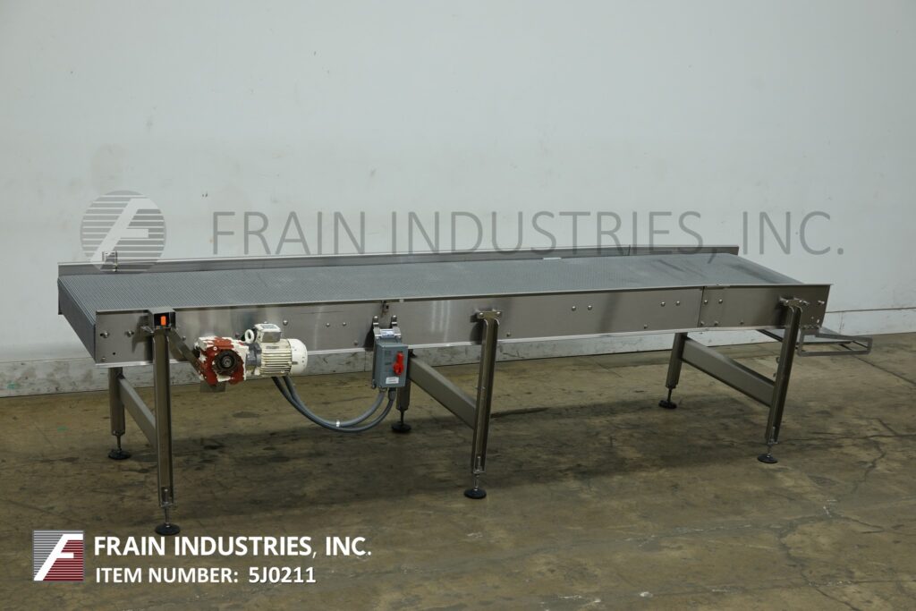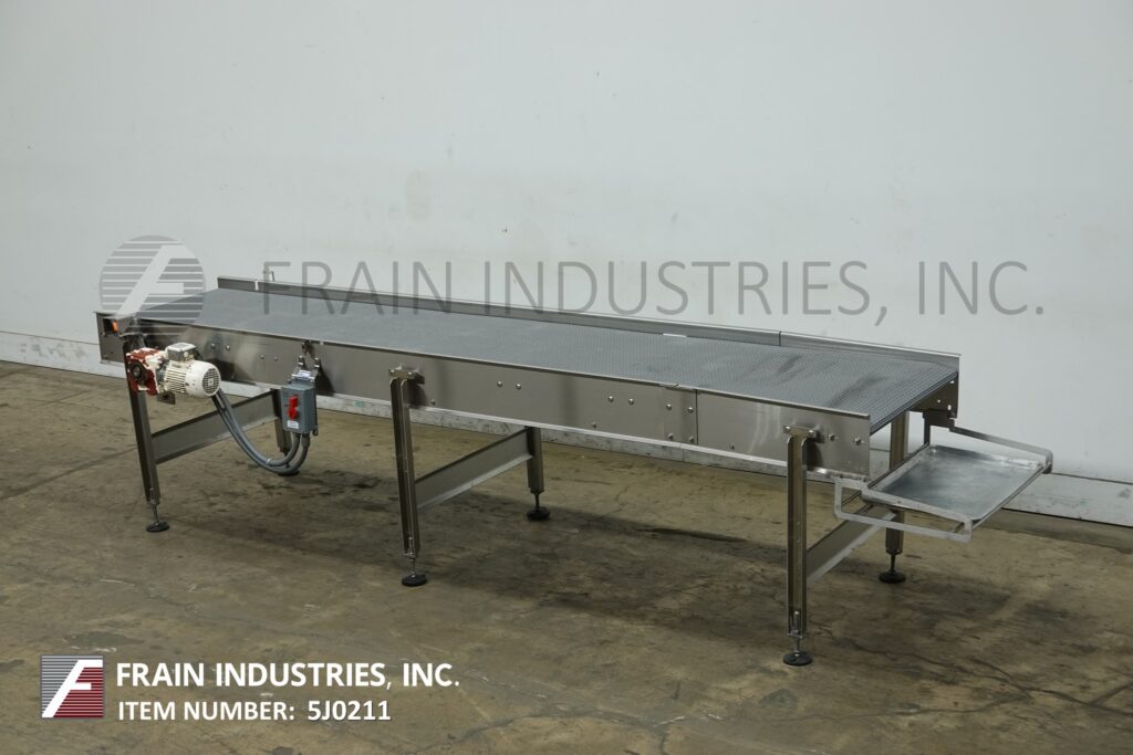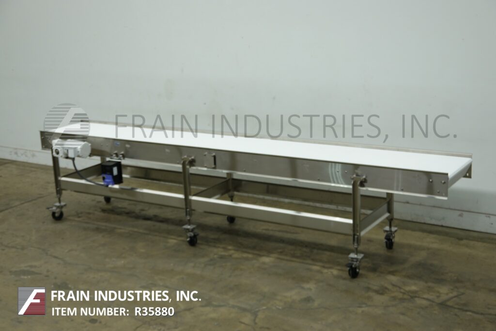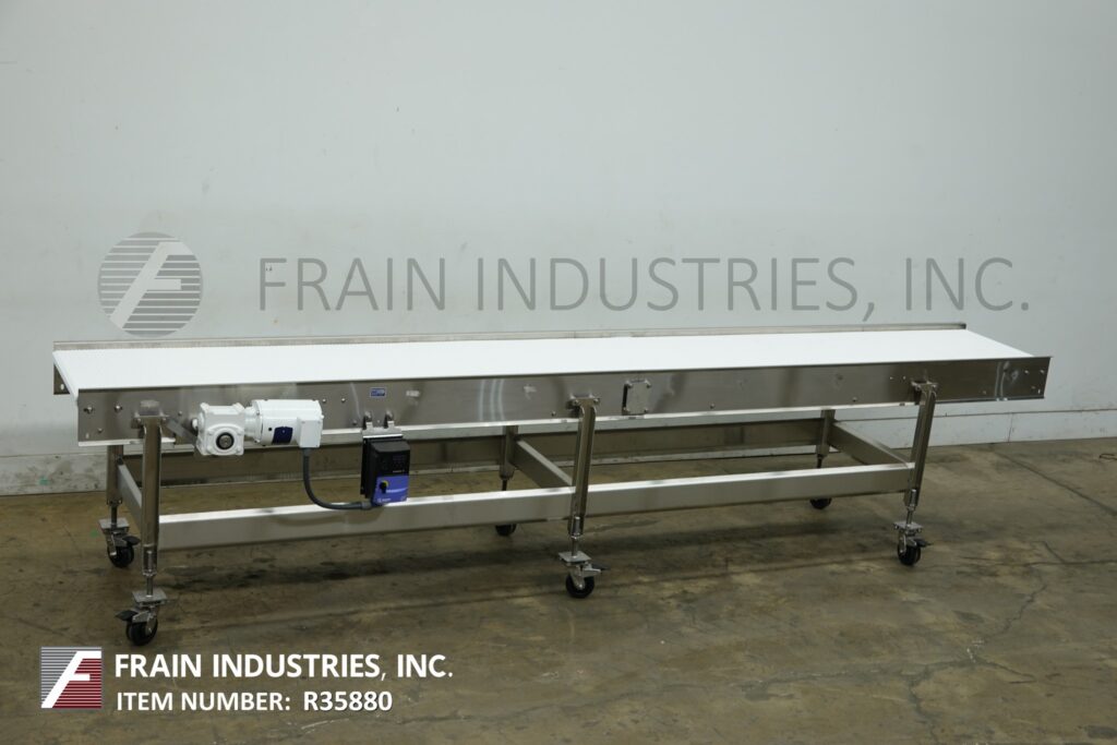 BMI stainless steel frame conveyor. Equipped with 30" wide x 148" long table top product conveyor belt and has 34" to 38" in feed and discharge height range and 18" x 30" tray rack. Powered by a ¾ hp drive with a variable speed controller. Mounted on stainless steel leg frame with leveling pads.