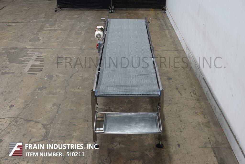 BMI, stainless steel inclined conveyor. Equipped with a 13" infeed height, 18" wide conveyor belt. Conveyor has a 67" long incline with a 72" long top horizontal run and a 36" discharge height. Powered by a ½ hp motor drive with variable speed and mounted on a (4) leg stainless steel base frame.