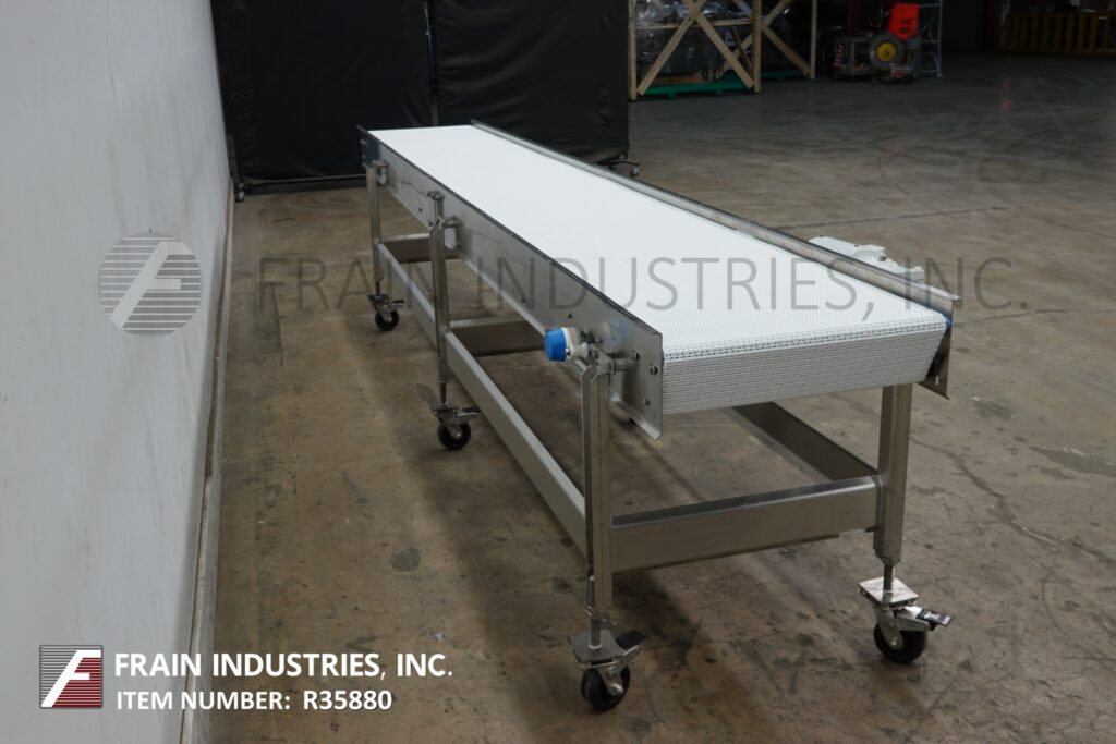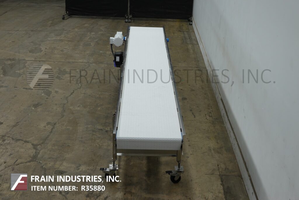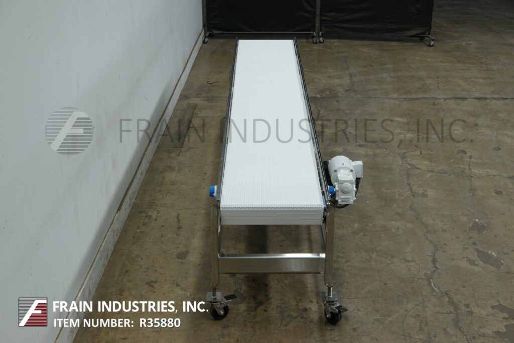 BMI stainless steel frame belt conveyor. Equipped with variable speed controler, 4½" wide x 56" long stainless steel table top product conveyor belt, adjustable guide rails and has 31" to 37" in feed and discharge height range. Mounted on (4) leg stainless steel leg frame with leveling pads.