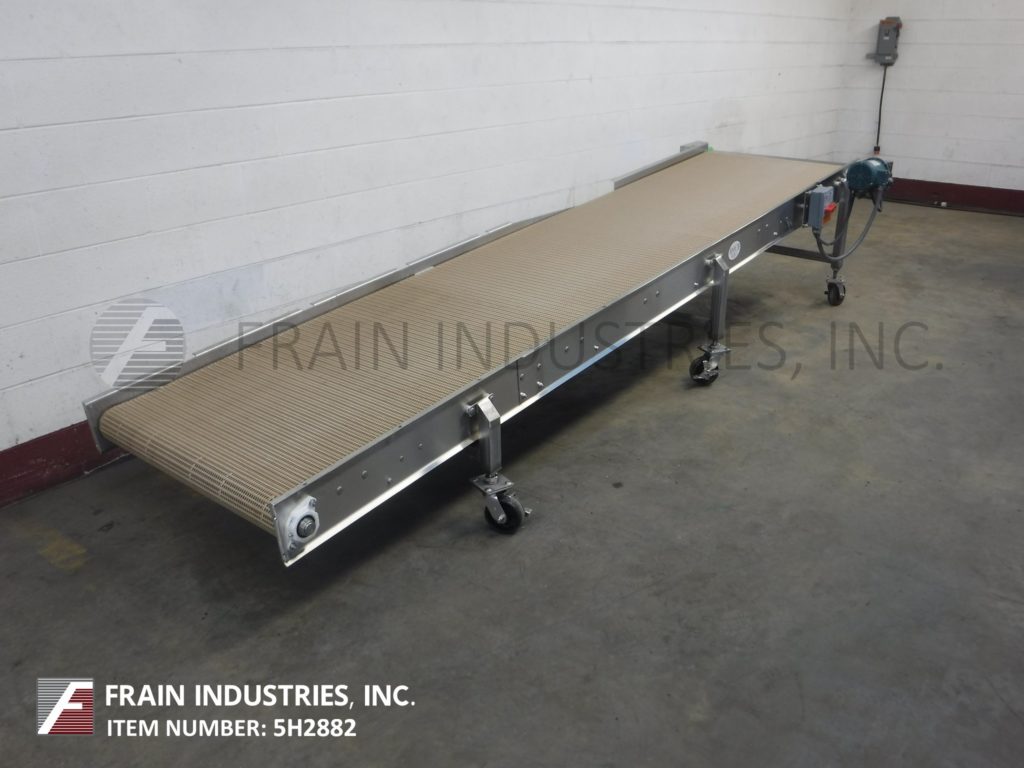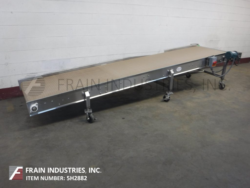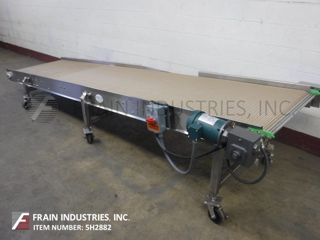 BMI stainless steel frame conveyor. Equipped with 24" wide x 240" long table top product conveyor belt and has 34" to 39" in feed and discharge height range. Powered by a ¾ hp drive with a variable speed controller. Mounted on stainless steel leg frame with leveling pads.