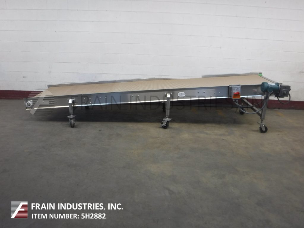 BMI stainless steel frame belt conveyor. Equipped with 4½" wide x 233" long Delrin table top product conveyor belt, adjustable guide rails and has 31" to 37" in feed and discharge height range. Mounted on (4) leg stainless steel leg frame with leveling pads.