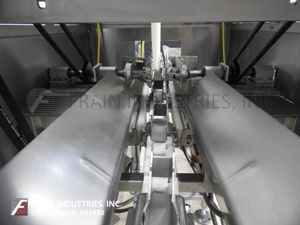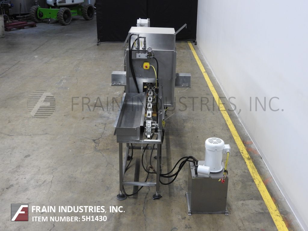 CMI Equipment, precision trimmer for topping and tailing. Rated from 20 to 65 count per minute with capacity of over 3,000lbs per hour – depending on materials, application, machine configuration and operator dexterity. Equipped with a 48" long load area, product holders set on 10" centers, automatic adjusting blades, and top hold down wheel through cutting head powered by a 5 hp hydraulic pack. Cutter discharges into a 10" wide x 55" long cleated incline conveyor with 2" high cleats set on 8" centers powered by a ½ hp drive. Feeder discharges onto a 78" long x 36" wide stainless steel cleaning table with (2) operator stations each with a foot pedal operated air blase and 12" diameter waste port.