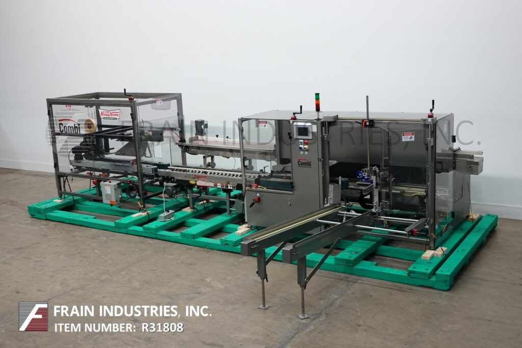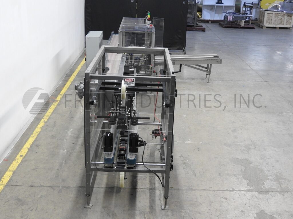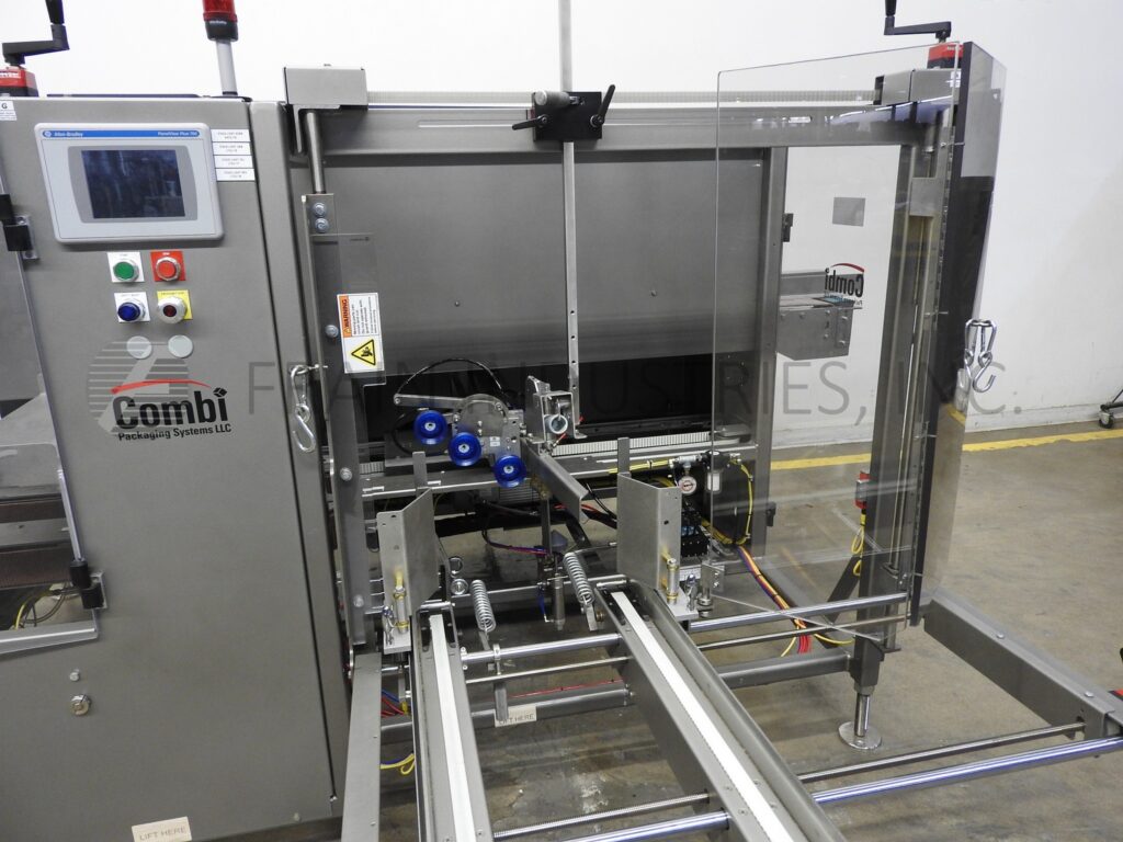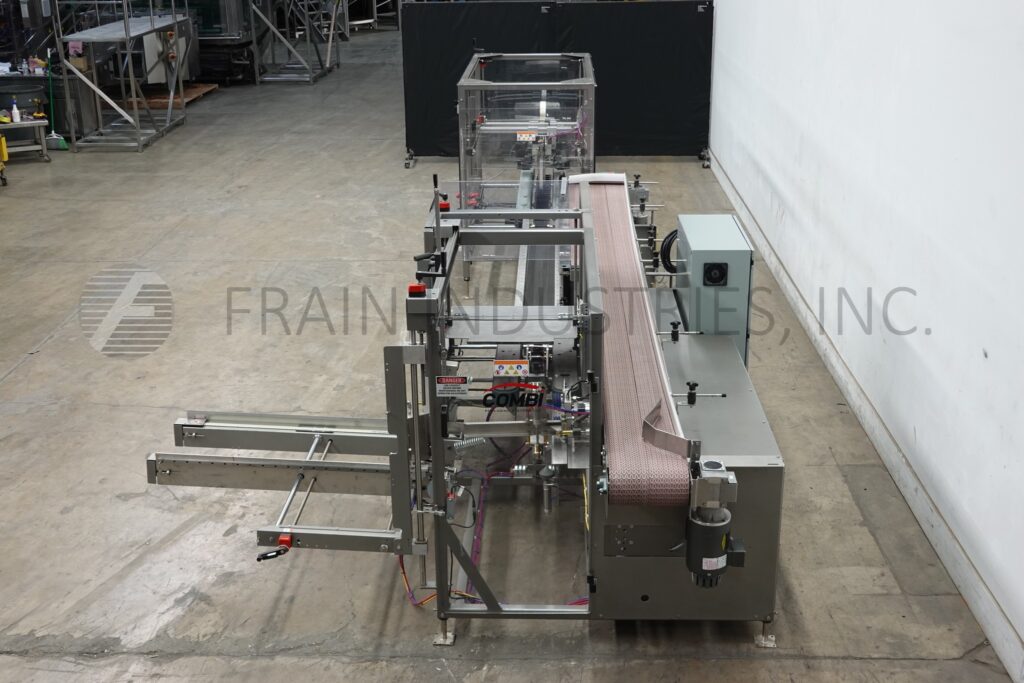 Combi, Model TBS-100 FC-XL, automatic, uniform, top flap closer, top and bottom case tape sealer. Rated from 10 to 20 cases per minute – depending on materials, and application. Case size range: 8" to 24" in Length; 6" to 16" in Width; 5" to 18" in Height. Equipped with 72" long x 2-1/4" wide dual side belt case assit conveyors, automatic top flap closer, major / minor flap plows, 2" top and bottom tape heads, hand crank adjustable with interlock lexan safety guarding doors. Control panel has push button start / stop / reset and e-stop push button controls. Mounted on (4) leg height adjustable frame.