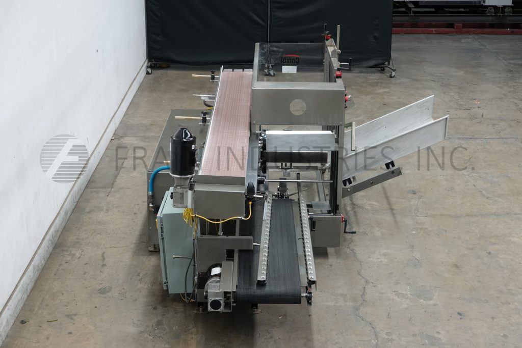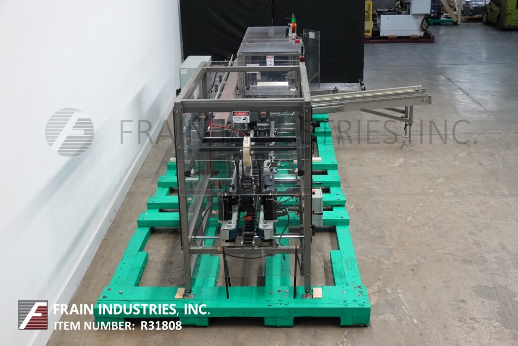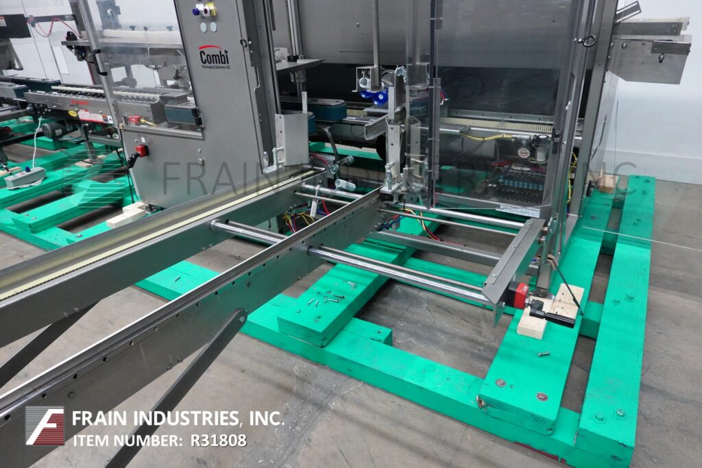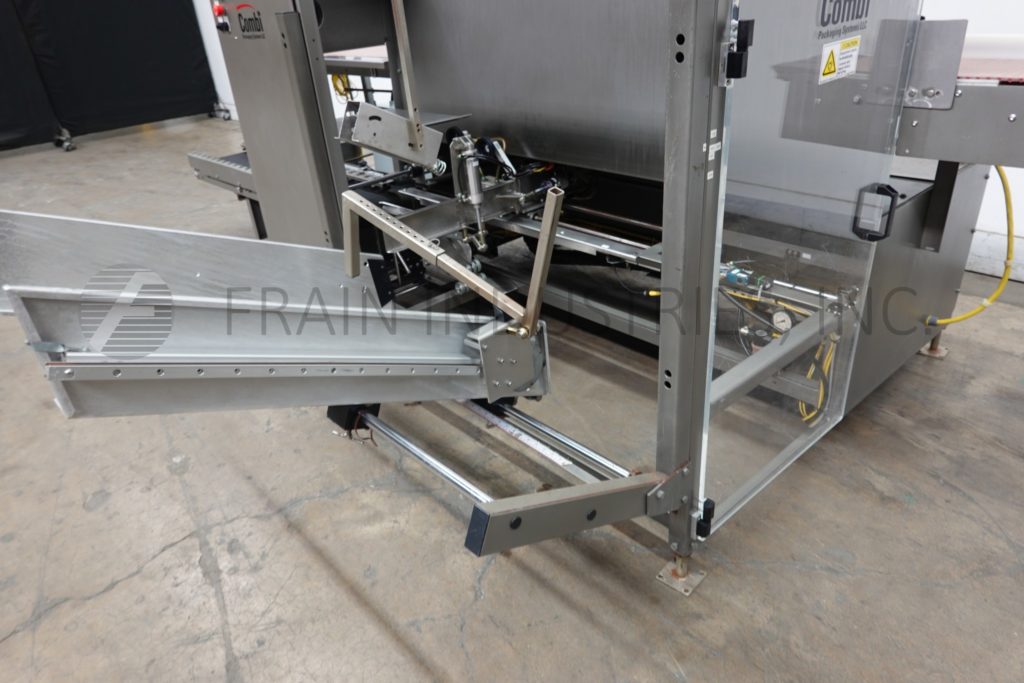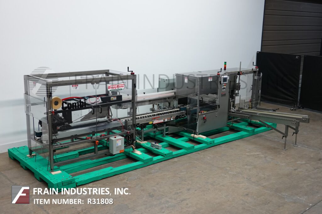 Combi, Model TBS-100 FC-XL, automatic, uniform, top flap closer, top and bottom case tape sealer. Rated from 10 to 20 cases per minute – depending on materials, and application. Case size range: 8" to 24" in Length; 6" to 16" in Width; 5" to 18" in Height. Equipped with 72" long x 2-1/4" wide dual side belt case assit conveyors, automatic top flap closer, major / minor flap plows, 2" top and bottom tape heads, hand crank adjustable with interlock lexan safety guarding doors. Control panel has push button start / stop / reset and e-stop push button controls. Mounted on (4) leg height adjustable frame.