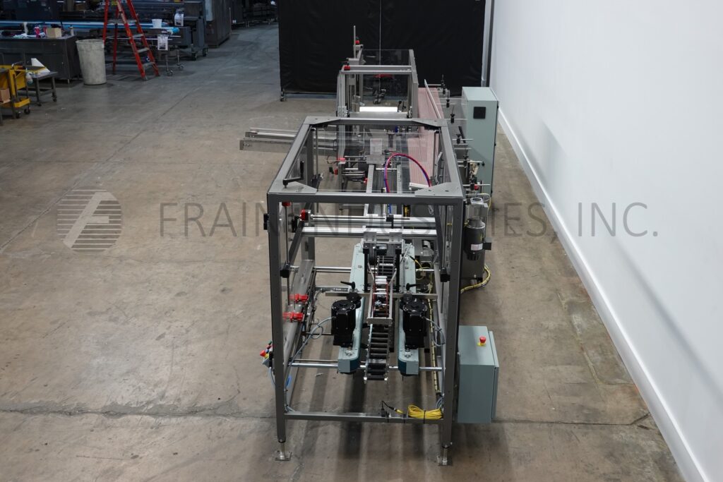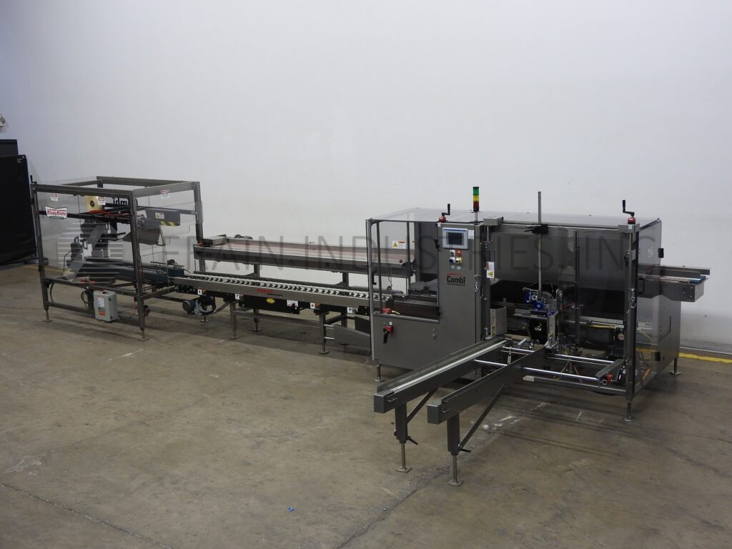 Combi America Model 2EZHS, Automatic, case erector, top and bottom tape packer rated from 5 to 20 cases per minute – depending on materials, application and operator dexterity. Case size range: 8" to 24" in Length x 6" to 16" in Width x 5" to 18" in Height. Equipped with easy load, blank case magazine, suction cup pic-n-place, minor and major flap closers, servo driven pusher bar, vacuum system, 2" tape head, hand crank no-tool adjustments and safety guarding, 12" wide x 196" long Intralox product conveyor running parallel to 12" wide x 96" long case conveyor to Model TBF, automatic, uniform, top flap closer, tape sealer. 72" long x 3" wide dual side belt conveyor, automatic top flap closer, major and minor flap plows, 2" top and bottom tape heads. Controll panel with controller and A/B variable speed controls. Mounted on heavy duty frame with safety guarding.