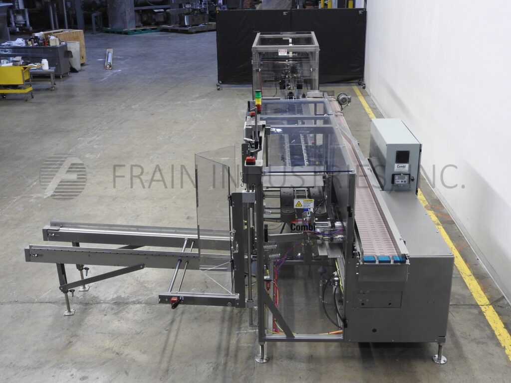 Combi America, Model 2EZHS, Ergopack. Case size range: 8" to 24" in Length; 6" to 16" in Width; 5" to 18" in Height. Equipped with 72" long blank case magazine, suction cup reciprocating pick and place, minor and major flap closers, mechanical pusher bar, 2" tape head, 12" wide x 214" long product conveyor and 104" long packing station running parallel to 8" wide x 118" long case conveyor. Top case taper equipped with minor flap closer, major flap plows, 3" wide dual side gripper belts, 2" top / bottom tape heads, hand crank adjustable with Siko gages and interlocking Lexan safety guarding. Control panel with tough screen HMI. Speed dependent on materials, application and machine configuration.