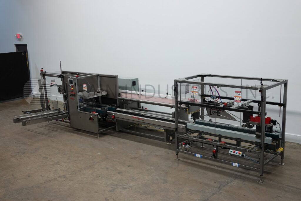 Combi America, Model 2EZHS, Ergopack. Rated from 5 to 20 cases per minute – depending on materials, application and operator dexterity. Case size range: 8" to 24" in Length; 6" to 16" in Width; 5" to 18" in Height. Equipped with 48" long blank case magazine, suction cup reciprocating pick and place, minor and major flap closers, mech pusher bar, 2" tape head, 12" wide x 192" long product conveyor with 80" long bi-directional accumulation and packing station running parallel to 12" wide x 94" long case conveyor. Top case taper equipped with minor flap closer, major flap plows, 3" wide dual side gripper belts, 2" top / bottom tape heads, hand crank adjustable with Siko gages and interlocking Lexan safety guarding.