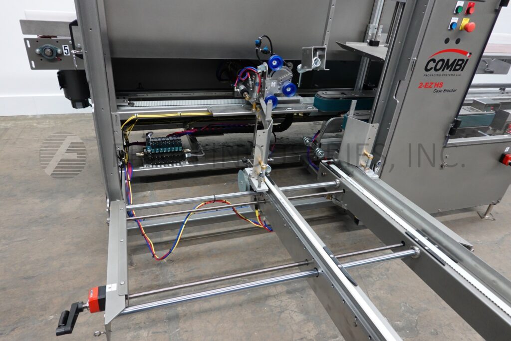 Combi America Model 2EZHS, automatic, case erector, bottom taper rated from 5 to 20 cases per minute – depending on materials, application and operator dexterity. Case size range: 8" to 24" in Length x 6" to 16" in Width x 5" to 18" in Height. Heavy duty welded steel construction. Equipped with easy load, 80" long automatic blank case magazine, (5) suction cup pic-n-place case erector, minor and major flap closers, 44" long x 3-1/4" wide dual side belt case indexing, 3" bottom tape head, hand crank no-tool adjustable, vacuum system and interlock safety guarding. Control panel has A/B controller with A/B panel view and safety reset, start, stop and e-stop controls with ethernet interface port and statis light bar. Mounted on height adjustable frame with leveling legs.