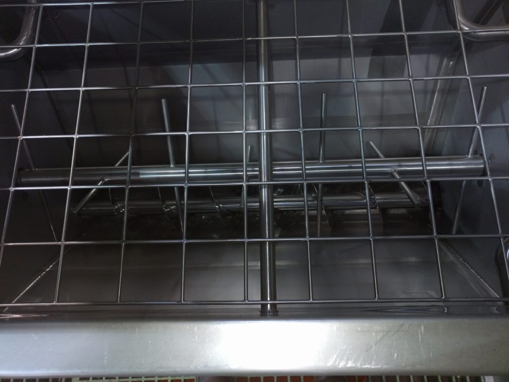 Commercial Manufacturing, 304 stainless steel delumper. Equipped with a 96" long x 48" wide x 76" deep, 175 ft³, bulk stainless steel product hopper with lift out safety grate, 84" long pin bar agitation with14 – 12" long x 1 1/4" dia pins, 84" long x 12" diameter bottom auger. Pin bar and auger powered by a common 7½ hp drive. Product discharges from a 13" x 13" chute with 40" ground clearance. Mounted on a stainless steel frame.