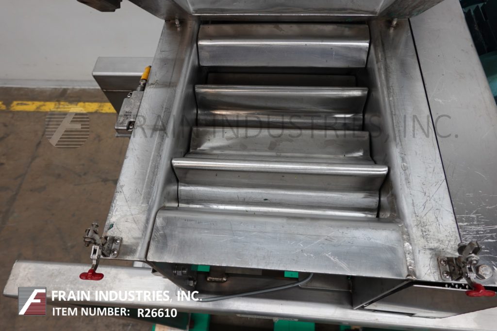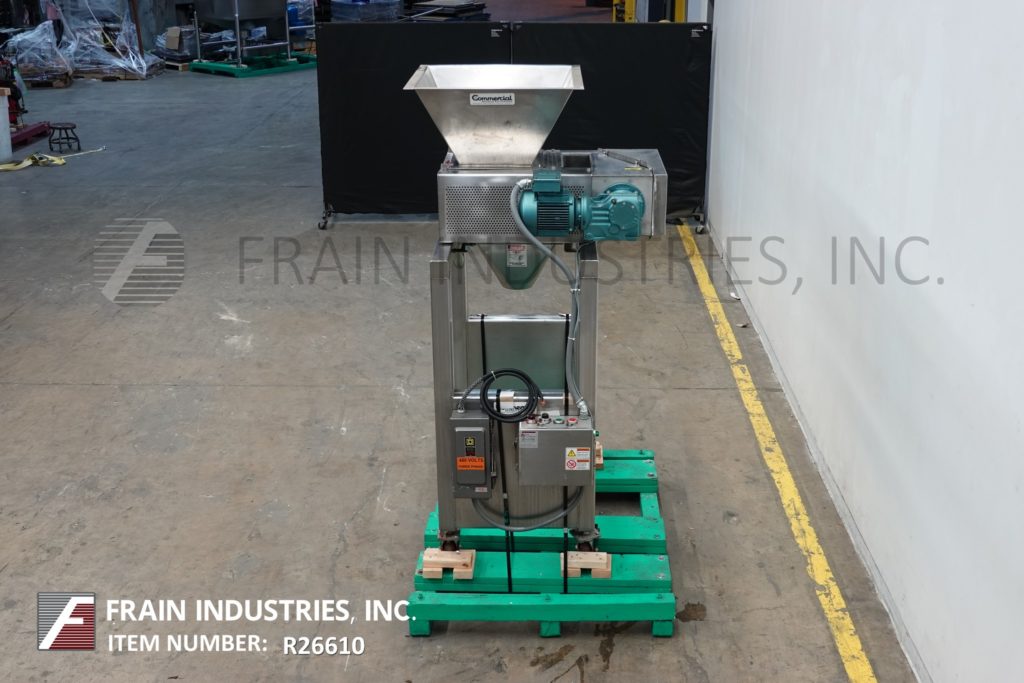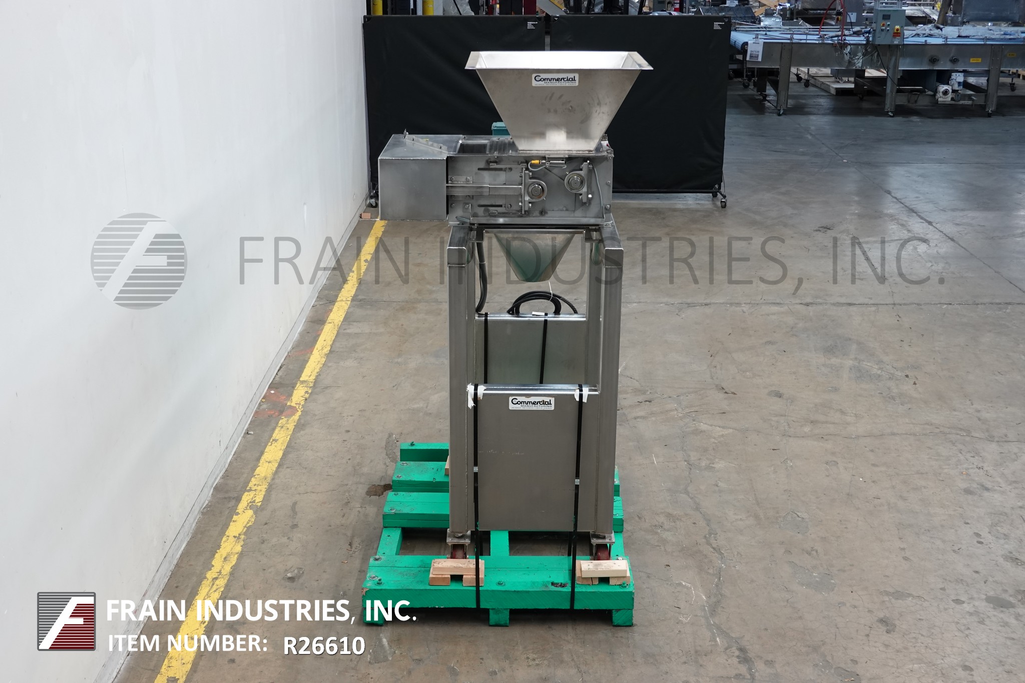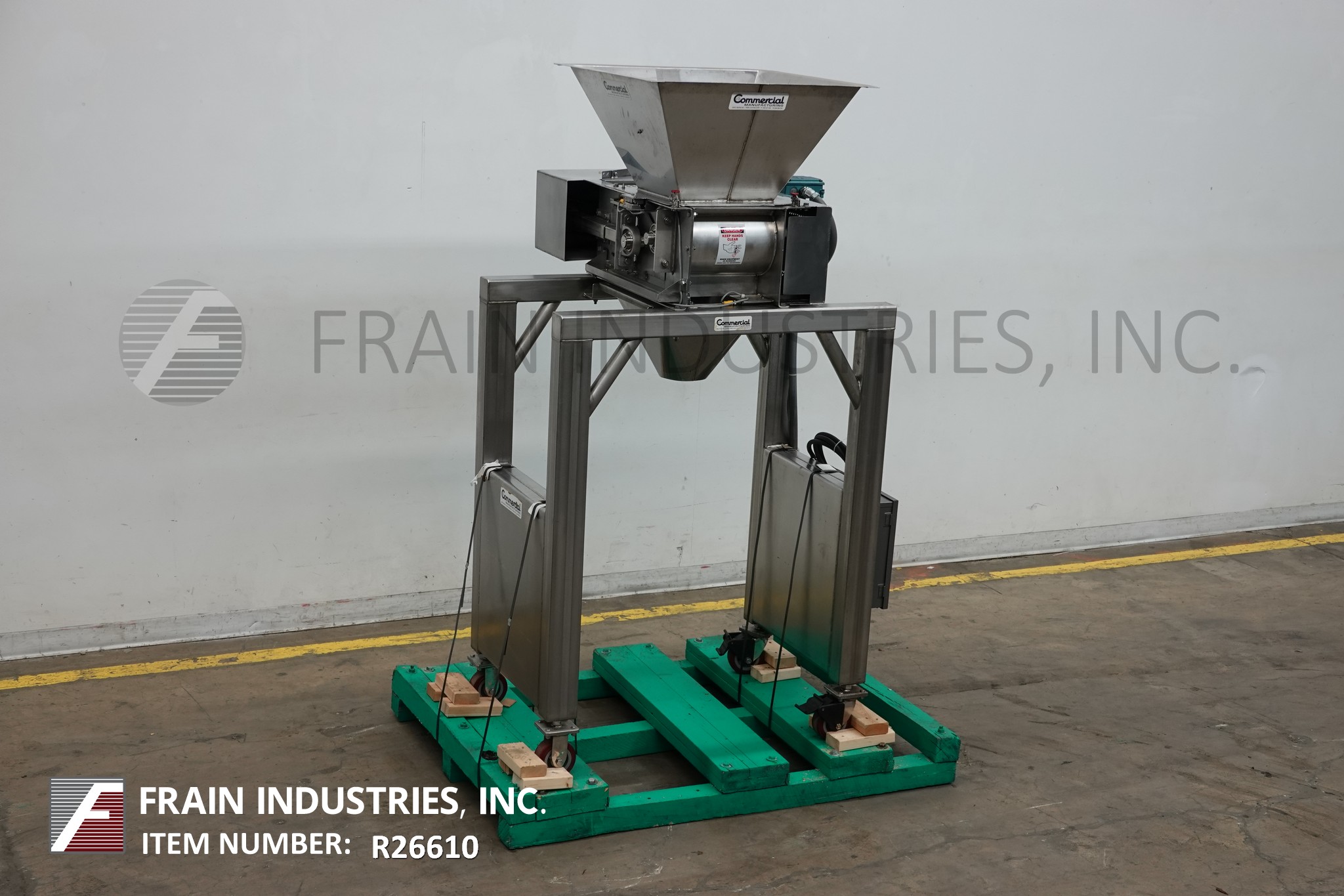 Commercial Manufactoring, Stainless steel product delumper with 25" L x 25" W, 6 ft³, bulk product hopper. Equipped with (2) 8" diameter x 12" long (5) pocket rotary lobe declumpers on 5" centers and 6" diameter center bottom discharge with 40" ground clearance. Control panel has start and stop push button controls. Mounted on stainless steel frame with casters.