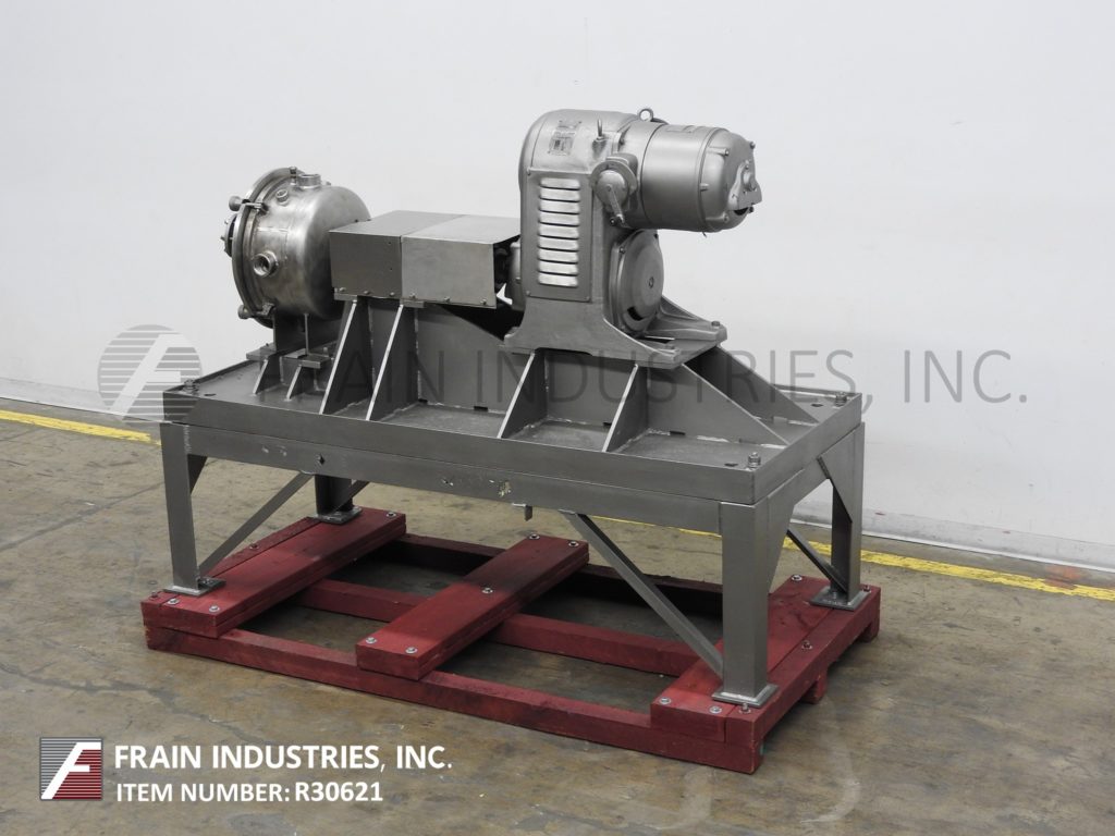 Cornell, Model D16, Variable speed "Versator" rated from 1 to 20 gallons per minute – depending on materials, application and machine configuration. 316 stainless steel contact parts (No. 4 Polish). Equipped with 16" ID disc, rotation rated from 1200 to 3220 rpm, with 2" OD / 1½" ID Tri-Clamp side chamber in feed and discharge product ports, 2½" OD / 2" ID Tri-Clamp top vacuum port, pressure gauge and 2" OD / 1½" ID Tri-Clamp bottom drain. Clamp down cover with 4" ID sight ports and 7½ Hp motor drive with variable speed gear reducer and pressure guage. Mounted on a heavy duty base.