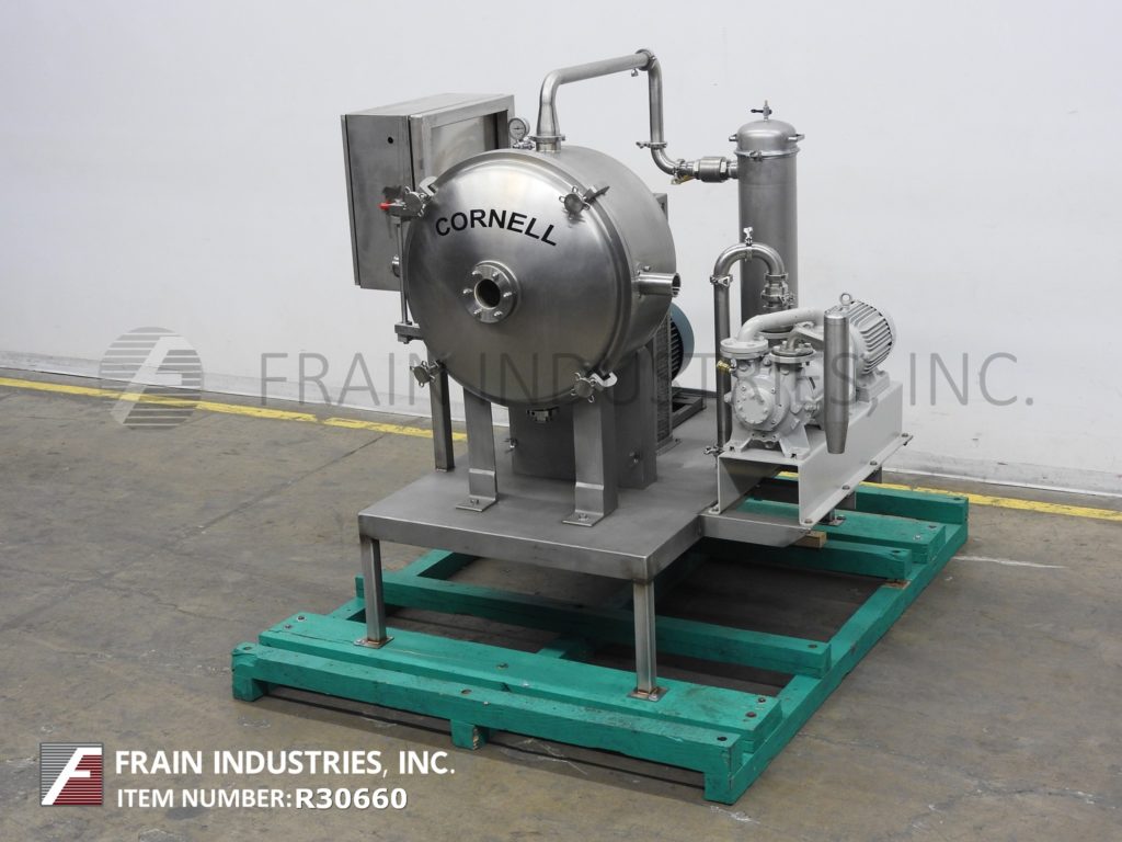 Cornell, Model D16, 304 stainless steel, Versator and vacuum pump. Rated from 1 to 20 gallons of product per minute – depending on materials and application. Equipped with 16" ID product rotating disc, 1" Tri-clamp infeed, 1½" Tri-clamp discharge, 2" Tri-clamp vacuum port. Boltdown door has 4" OD sight port. Versator powered by 7½ Hp, vacuum pump powered by 7½ hp drive. Mounted on portable base with castors.