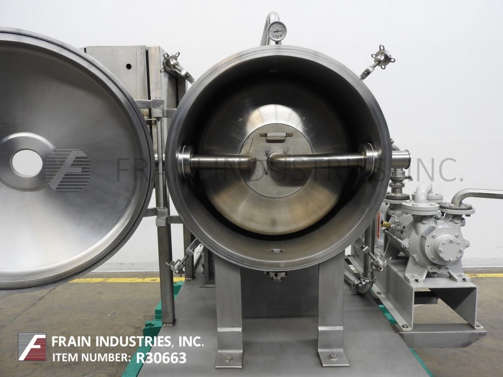 Cornell Model D26, "Versator", deaerator, with vacuum system rated from 5 to 125 gallons and 1000 to 3200 rpm per minute – depending on materials, application and machine configuration. Equipped with a 26" diameter product rotating disc, (2) 2" NPT side chamber product charge and discharge ports, (1) 1½" NPT top vacuum port, pressure gauge and 2" NPT bottom drain. Swing open bolt down door has (2) 7¼" OD / 3½" ID front flanged sight ports, 15 Hp (4) belt to motor main drive with safety guarding and Stokes Model 148H-9 2 hp vacuum system with (2) 1¾" NPT fittings. Mounted on a 72" long x 49" wide base platform frame.