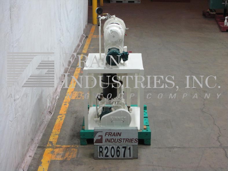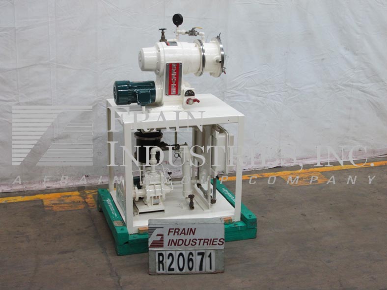 Cornell Model D-8 variable speed "Versator" with vacuum pump, rated to 2 gpm, depending on product and viscosity. Unit has a 8" diameter disc, a 1/2" product inlet, 1/2" product discharge, a 1/2" top vacuum port, with gauge and a 1/2" bottom drain. Product flows through a film-forming ring out and over the surface of the rotating disc at which time the dispersion/deaeration action occurs. Disc rotation rated from 2000 – 6000 rpm. Commonly used for despersion, and deaeration for food, cosmetic, pharmaceutical and chemical applications. Includes 316 S/S contact parts, quick release glass cover and AB starter boxes. Mounted on a painted steel base. Kinney 3/4 hp vacuum pump. Last running in a pharmaceutical operation.