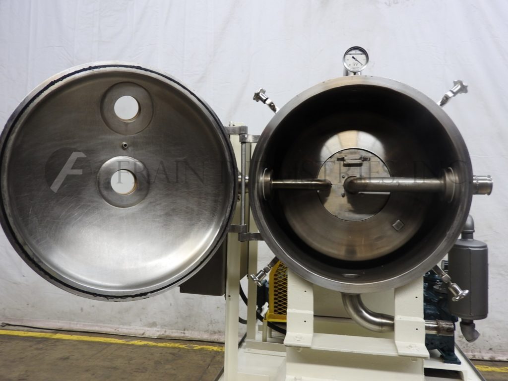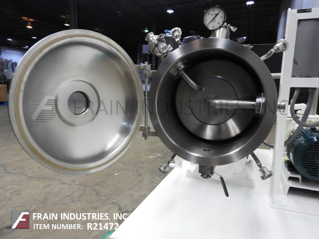 S/S "Sanitary Versator" with vacuum system. Equipped with 7.5HP variable speed drive with speed range from 1200rpm to 4000rpm and a flow rate up to 20 gallons per minute depending on product. Product flows through a film-forming ring out and over the surface of the rotating disc at which time the dispersion/de-aeration action occurs. Includes quick release cover with site glass.