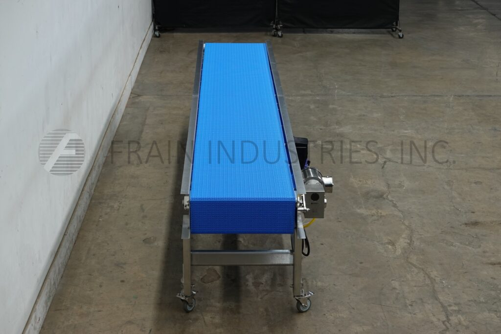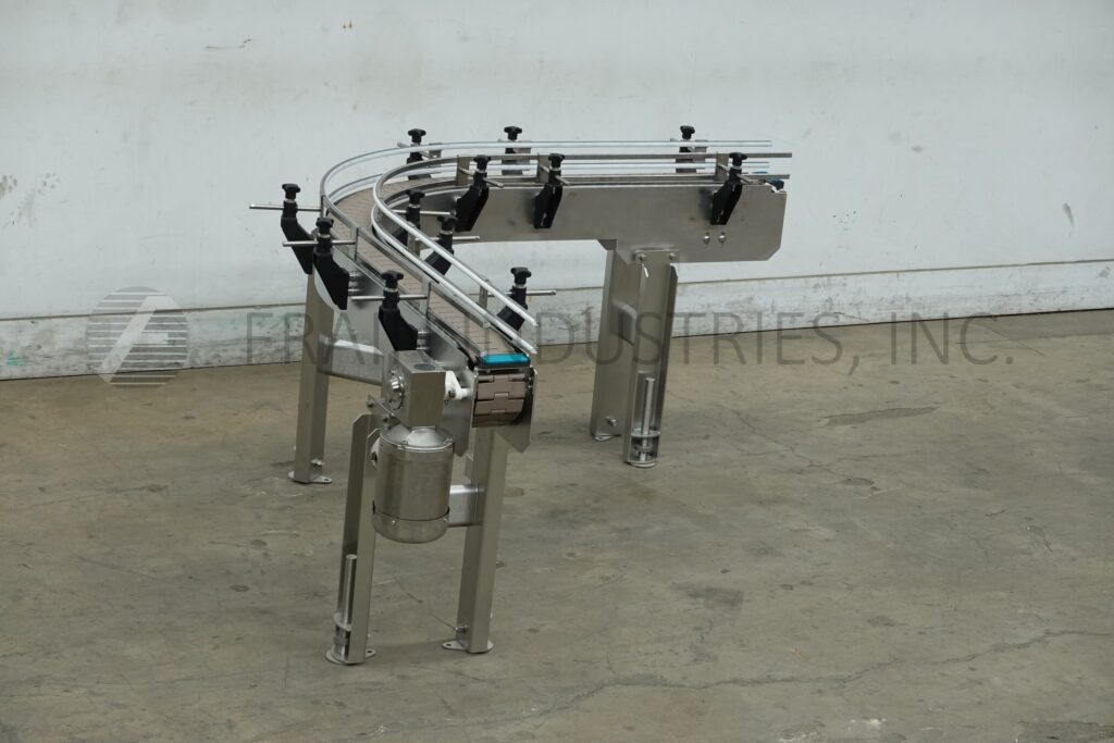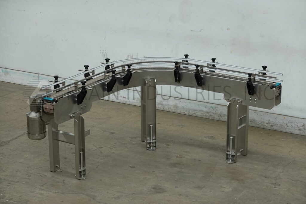 Custom Cut Metal, Model CCMM015792, 90° stainless steel frame conveyor. Equipped with a 4½" wide belt, 48" long infeed to 90° right hand turn to a 48" long discharge with a 33" – 38" infeed / discharge height range and powered by a ½ hp drive.