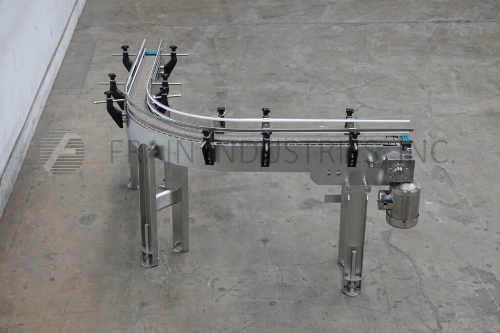 Custom Cut Metal, Model CCMM015792, 90° stainless steel frame conveyor. Equipped with a 4½" wide belt, 48" long infeed to 90° left hand turn to a 48" long discharge with a 33" – 38" infeed / discharge height range and powered by a ½ hp drive.