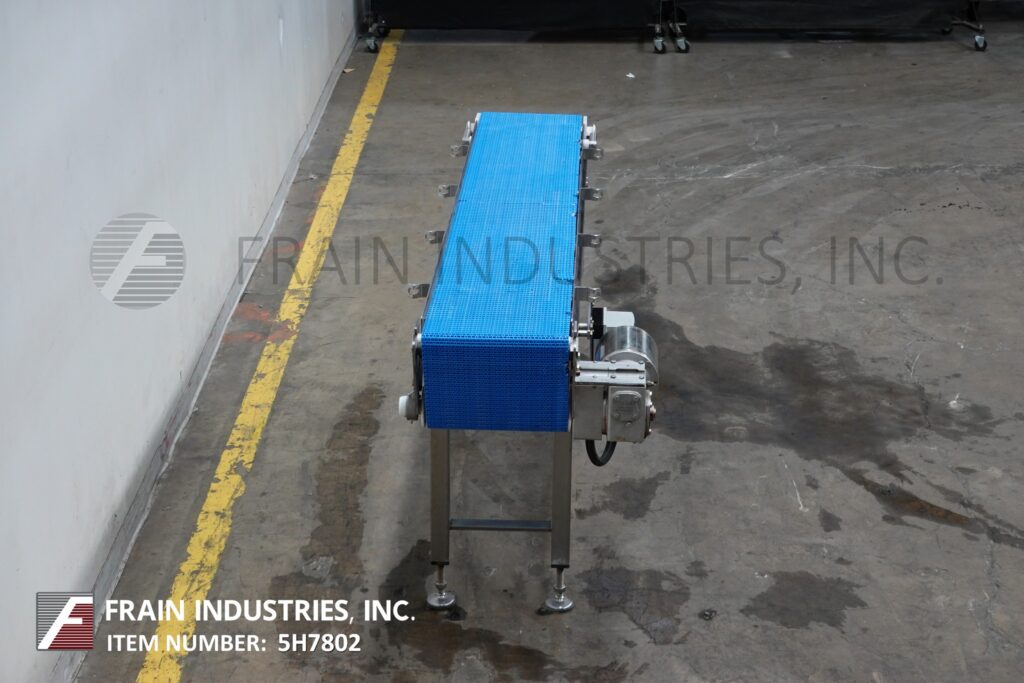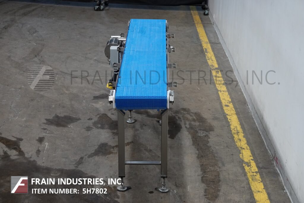 Dorner, 14" wide x 94" long stainless steel table top conveyor. 14" wide and 94" long Intralox belt has an infeed and discharge height of 37". Equipped with a ½ HP drive, variable speed control and mounted on leveling legs.