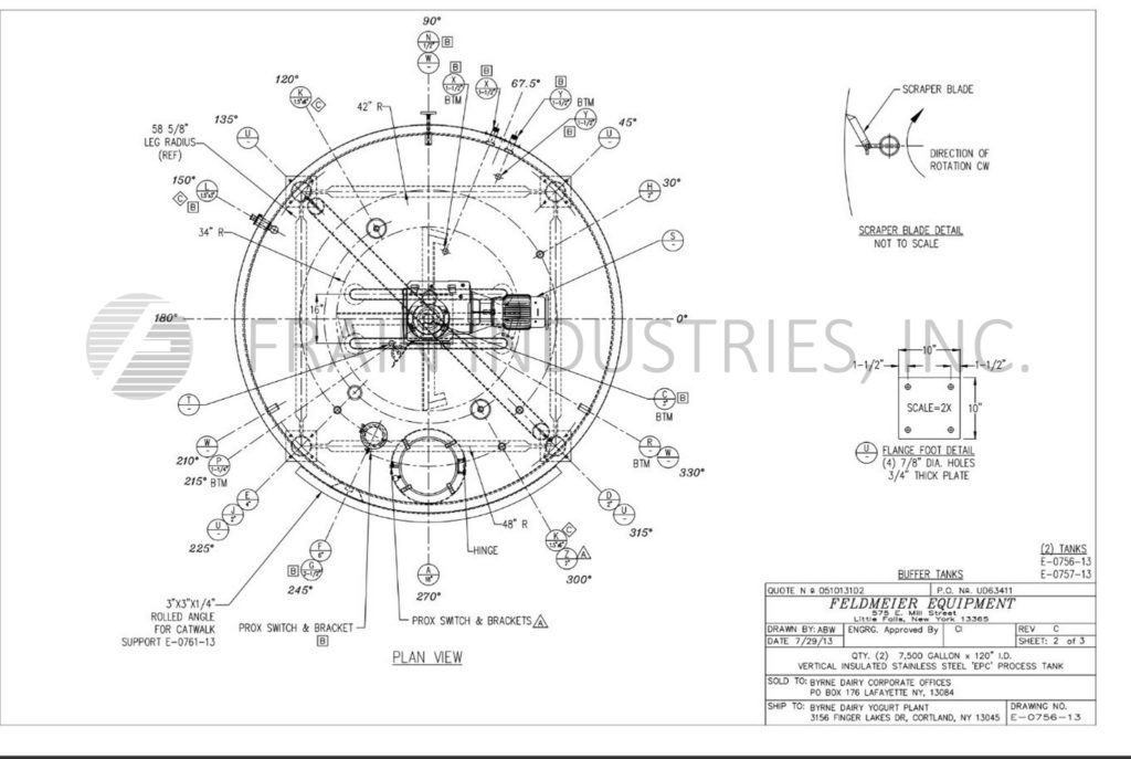 Feldmeier, 7500 gallon capacity, stainless steel jacketed and insulated process tank. 304 stainless steel contact parts and 304 stainless steel jacket and exteroir parts. Vessel dimensions: 120" diameter with 144" straight wall. Equipped with dome top, 18" diameter bolt down man way, top mounted 10 Hp side and bottom scrape surface agitation, baffle, (2) CIP spray balls supplied by 2"OD / 1½"ID Tri-clamp fittings and thermowell. Dish bottom has 3½" OD / 3" ID center bottom pneumatic valve discharge with 30" ground clearence. Control panel with push button start / stop and variable speed control. Mounted on (4) legs with foot pads.