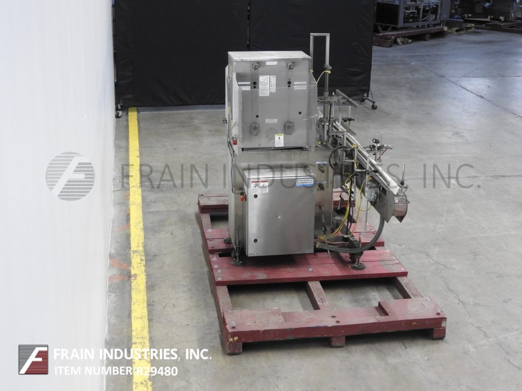 Filamatic Model MNB-2000, 1-up, Automatic, monoblock filler, tipper and capper rated 10 to 50 containers per minute – depending on materials and application, 316 stainless steel product contact parts, Container size range: 1/2" to 2-14" in Diameter; 1" to 5" in Height. Fill range: 0.5ml to 500ml with accuracies of + / – 0.5% and can handle low, moderate and high viscosity products with proper change parts. Equipped with empty container feed system with container chute, 16 pocket container carousel with 1-up filler, dual vibratory stainless steel tip and cap feed hoppers with single head screw capper, bottom up fill and missing bottle, tip, cap detection and Seko guages. Touch pad controller with panel view and operator interface data information control system has reset, start, stop and e-stop push buttons. Mounted on stainless steel frame with interlock safety door guarding and Hepa filtration system.