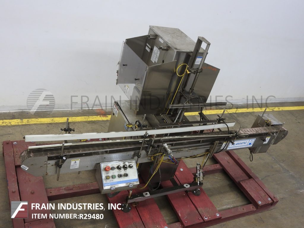 Filamatic, Model H-Z-300, automatic, 4 head piston filler with number of containers per minute – depending on materials and application. Stainless steel contact parts. Fill range up to 1100cc with proper change parts. Equipped with 3-1/2" wide x 112" long delron product conveyor, pneumatic indexing, diving nozzles. Control panel with controller has auto, prime, conveyor on / off and multi-stroke switches, filler control dial and start, stop and e-stop push buttons. Mounted on stainless steel base frame.