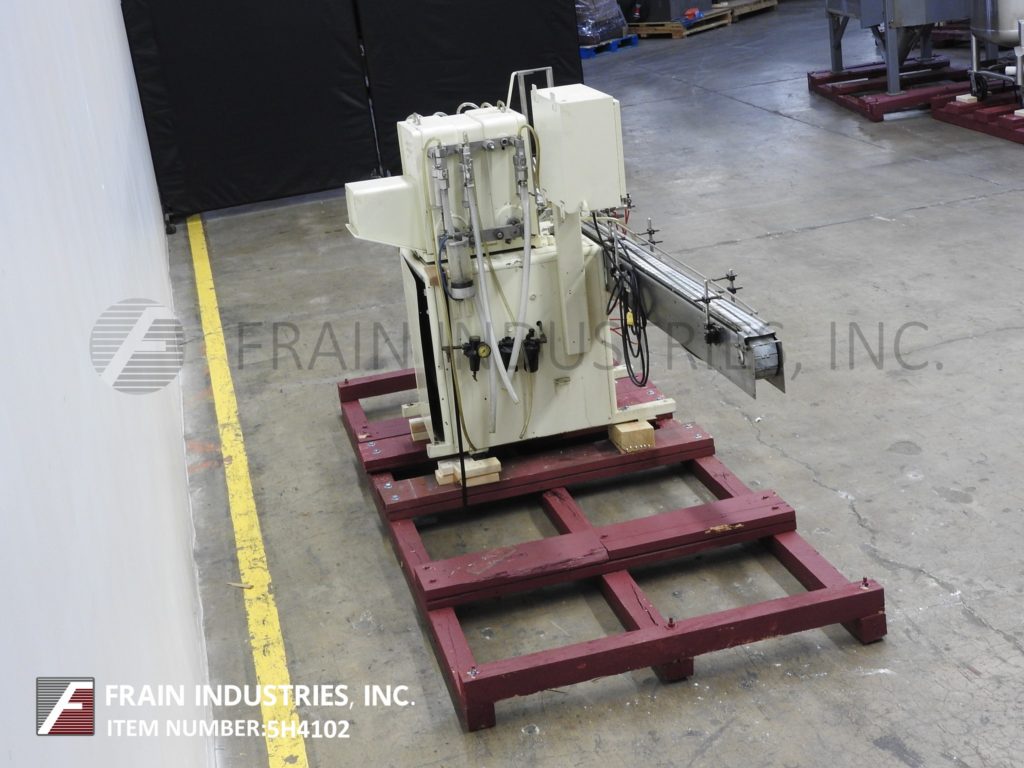 Filamatic Model CVK-500 12 head, high speed in line, automatic piston filler for free flowing, semi viscous and viscous product rated from 24 to 120 containers per minute – depending on materials and application. Fill volume: 0.10cc to 1300cc single stroke (with proper change parts) Currently set with 30cc pistons. Equipped with 136" long x 3-1/4" wide plastic delran conveyor with star wheel indexing, currently set with (12) 30cc pistons, set on 3-1/2" centers. Control panel has filler, conveyor and hesitation speed controls with start, stop and e-stop push buttons. Mounted on stainless steel base frame with height adjustable legs.