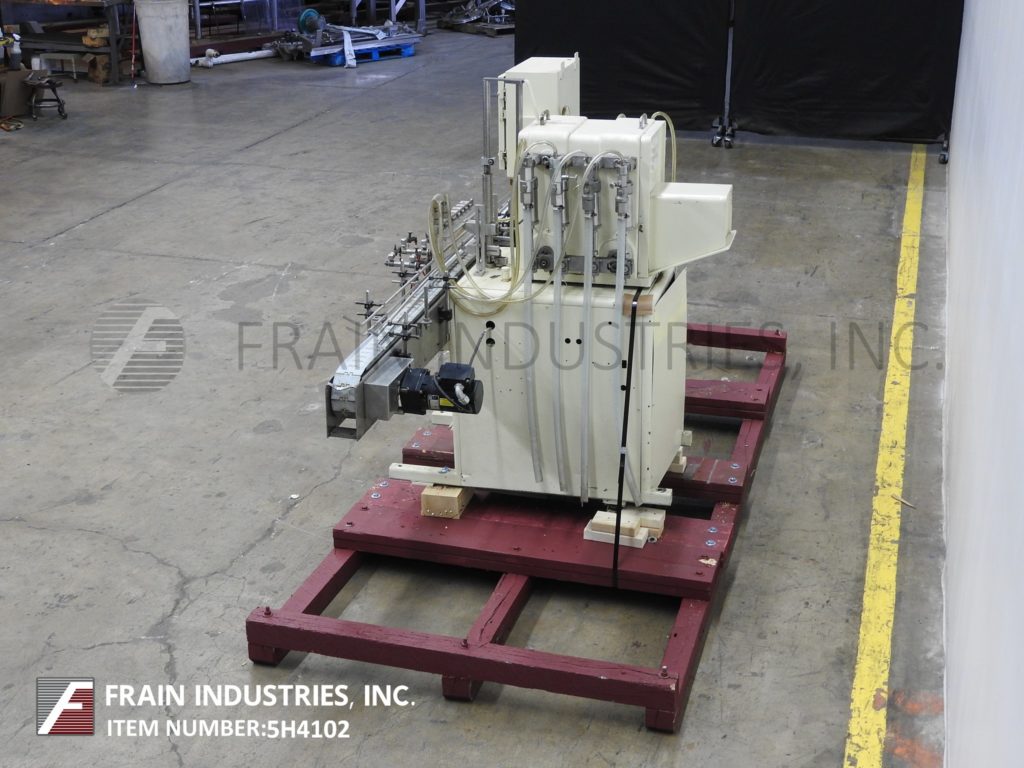 Filamatic, Model VLD, 4 head inline piston filler. Rated from 12 to 60 bottles per minute with a fill range of 60ml to 520ml with proper change parts – depending on materials, application and machine configuration. Equipped with 96" long by 3¼" wide Delrin conveyor, star wheel indexing, adjustable guide rails, (4) 520cc pistons and (4) (5/8)" OD diving nozzles with positive cut off mounted on a 16" long slide bar. Control panel with Omron PLC and push button start / stop / reset / e-stop controls. Mounted on base frame with leveling legs.