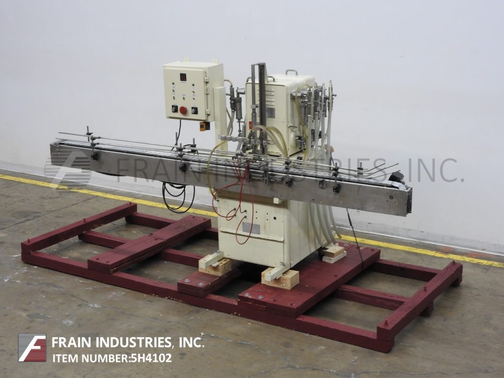 Filamatic, Model DAB-16-4, automatic, inline, 8 head piston filler. Rated from 3 to18 cycles per minute with number of container – depending on materials and application. Stainless sreel contact parts. Fill range of: 60cc to 520cc with proper change parts. Equipped with 3¼" wide x 112" long delrin container conveyor currently set with (8) FKS 130cc pistons with fill accuracies of ± 0.5%, pneumatic gate indexing, (3/8)" OD diving nozzles and Control panel with on / off switch, strokes per cycle selection and variable speed dial. Mounted on heavy duty base frame.