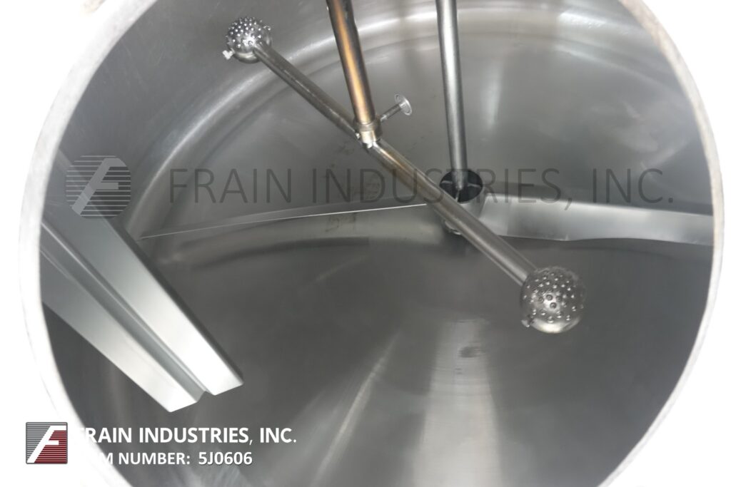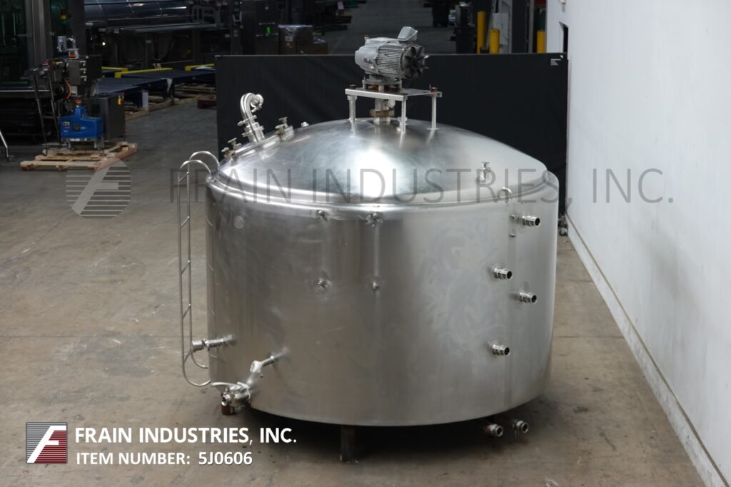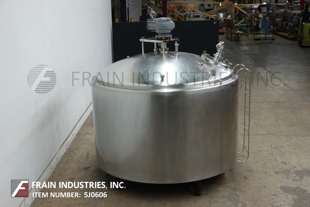 Girton, 1,000 gallon capacity, 304 stainless steel jacketed vacuum processor. Vessel Dimensions: 84" dia x 48" straight wall. Equipped with 16" manway, top mounted sweep agitation, thermowell and CIP spray balls. slant bottom has 2½" OD / 2" ID seated bevel discharge with flow control valve and 12" ground clearance.