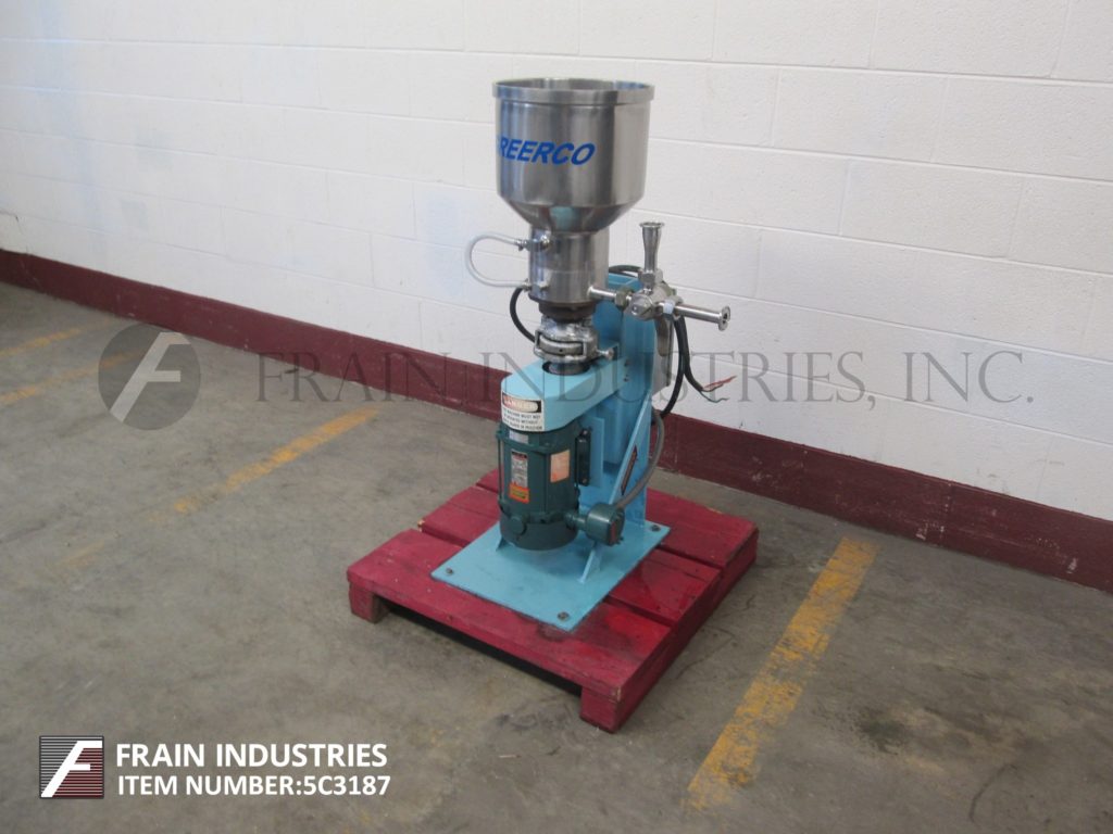 Greeco Model W250V colloid mill capable of complete dispersion and deagglomeration of liquids in liquids or solids in liquids at rates from 5 to 150 Gallons per hour – depending on materials and application. Equipped with 12" diameter 5 gallon capacity 316 stainless steel hopper with recirculation pipe and bypass valve for multipass operation, truncated cone shaped 2-1/2" diameter rotor and a concave shaped stator. controller with start / stop controls and mounted on base frame. Used for cosmetics, emulsions, oils, dispersions, waxes and others