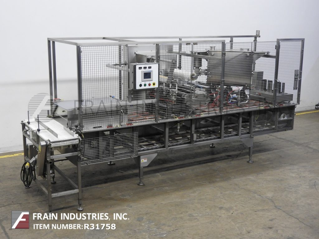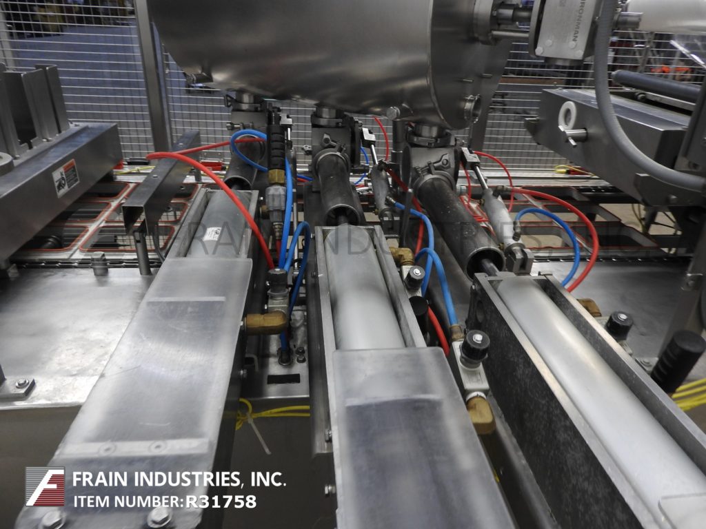 Holmatic Model PR-3S, 3 lane, inline, stainless steel, tray filler, roll stock film sealer rated from 30 to 120 trays per minute – depending on materials, application and machine configuration. Sanitary stainless steel and hard anodized aluminum construction. Container size range: per application. Fill volume up to 90oz each head. Change parts required to accommodate different sizes. Equipped with 180" long cup conveyor has 8-3/4" long x 24" wide carrier plates with (3) 7-3/4" long x 5-1/2" wide rectangle tray pockets set on 9" centers, tray de-nest station, 30" long x 17" wide x 24" deep, stainless steel, jacketed, agitated product hopper, (3) head piston filler, with (3) 15" long x 2-1/4" ID pistons, and 2-1/4" OD nozzles (change part per application) no container / no fill, automatic film roll stock feeder and rewinder with die cut heat sealing stations. Control panel has A/B PLC controller with A/B onboard panelview and operator read out (3) heat seal, start, stop, e-stop controls. Mounted on stainless steel frame with cage style safety guarding.