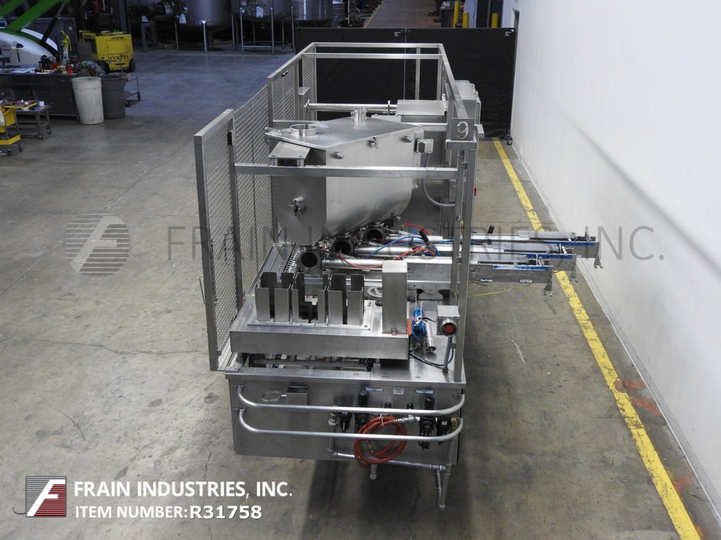 Automatic, S/S, 1 x 3 , USDA – wash down, intermittent motion piston style cup filler. Capable of a container size range to 5" diameter and height to 7 ". Equipped with 32 ounce piston with rotary valve capable of down to a 7.25oz fill. Shuttle type overlidder with magazine that are well suited for the "tamper evident " and flat style lids. Automatic container eject. Unit will denest container from a magazine, fill product, overlid and discharge container. Can be used with either paper or plastic containers. Last running in a dairy operation.