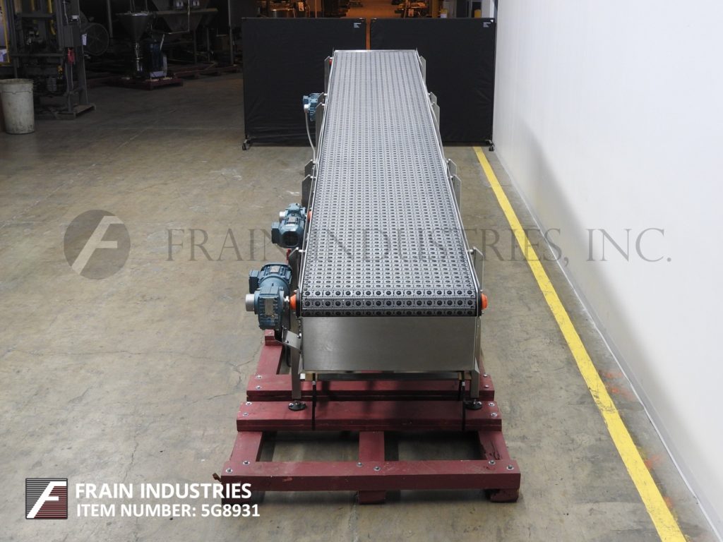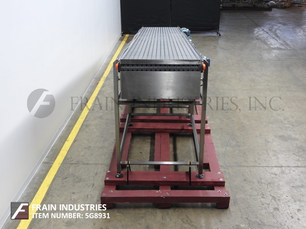 Intralox, Model ARB. stainless steel, activated roller belt conveyor enables accurate and reliable aligning of products with number of product per minute – depending on materials and application. Equipped with (2) 12" wide x 58" long activated rollers belts powered ½ Hp motor drive with safety guarding has 34" in feed and discharge height. Angled rollers embedded in the belt surface gently align products parallel along the length of the conveyor.