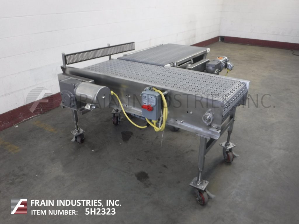 Stainless steel, two tier, pack off conveyor. Equipped with (2) 14" wide x 132" long stainless steel shelves, (1) 24" wide x 132" long Intralox belt with an infeed and discharge height of 41" and (1) 24" wide x 132" long Intralox belt with an infeed and discharge height of 24". Bottom belt has 9½" overhead clearance. Both belts independently powered by 1 hp drives each with variable speed controls and push button stop / start.
