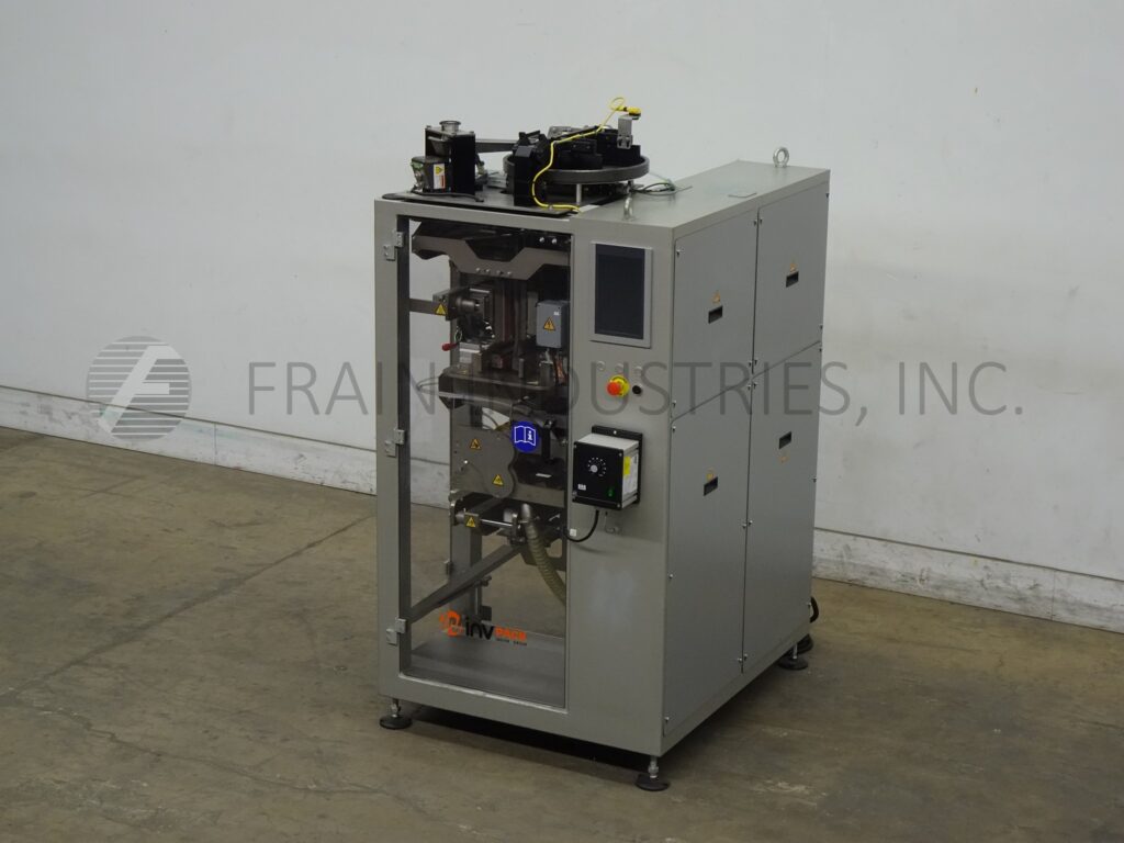 INVpack, Model MVA3, Automatic, vertical, stainless steel, form, fill and seal sachet machine. Rated 20 to 100 sachets per minute – depending on materials, appliaction and machine configuration. Roll size: 300mm max film width; 300mm max OD. Sachet size range: 40mm to 150mm in width; 50mm to 150mm in length (depending on how many lanes are being used). Equipped with single web, film registration, (4) 6½" long vertical seal bars, (1) 7" wide horizontal seal bar with tear notch, emboss coder, slitter wheels with vacuum trim removal and cut off knife. Control panel with touch screen HMI.