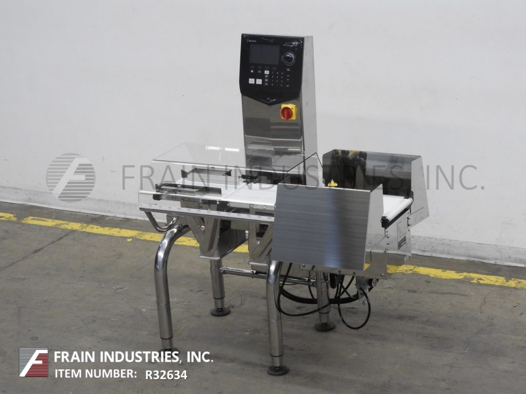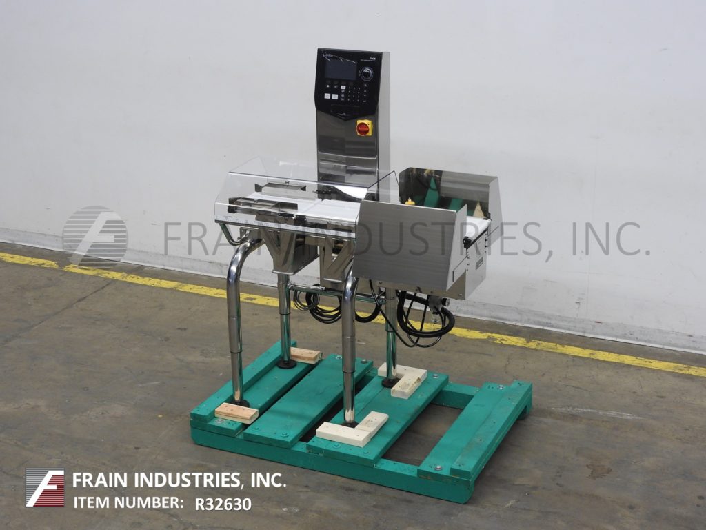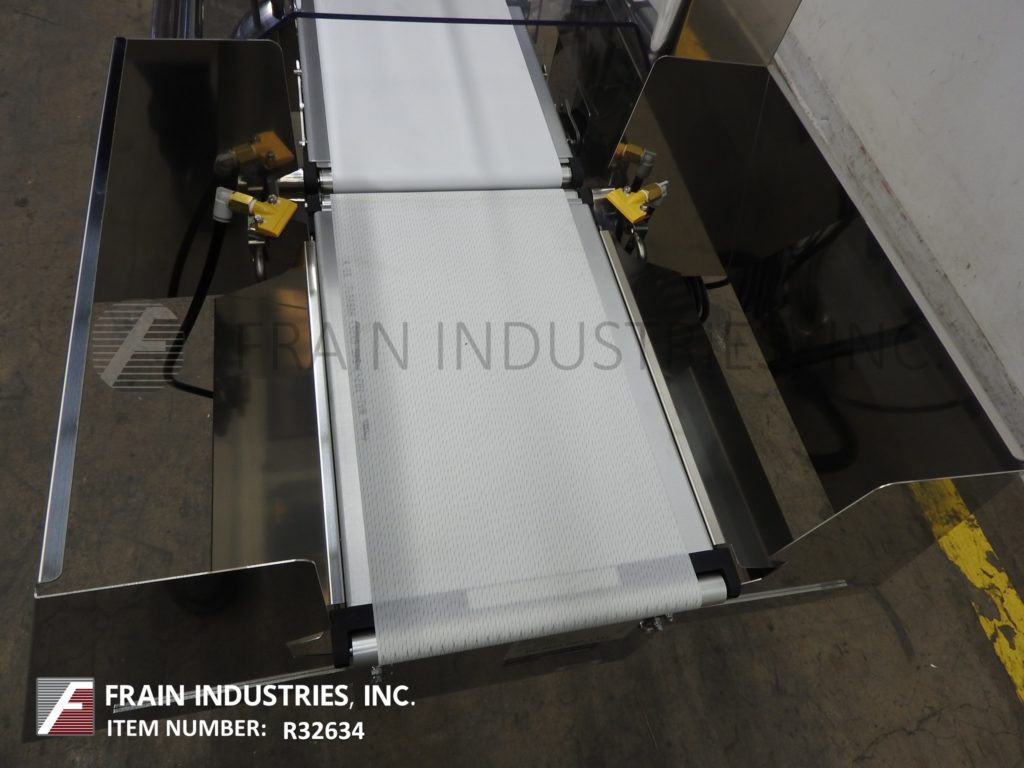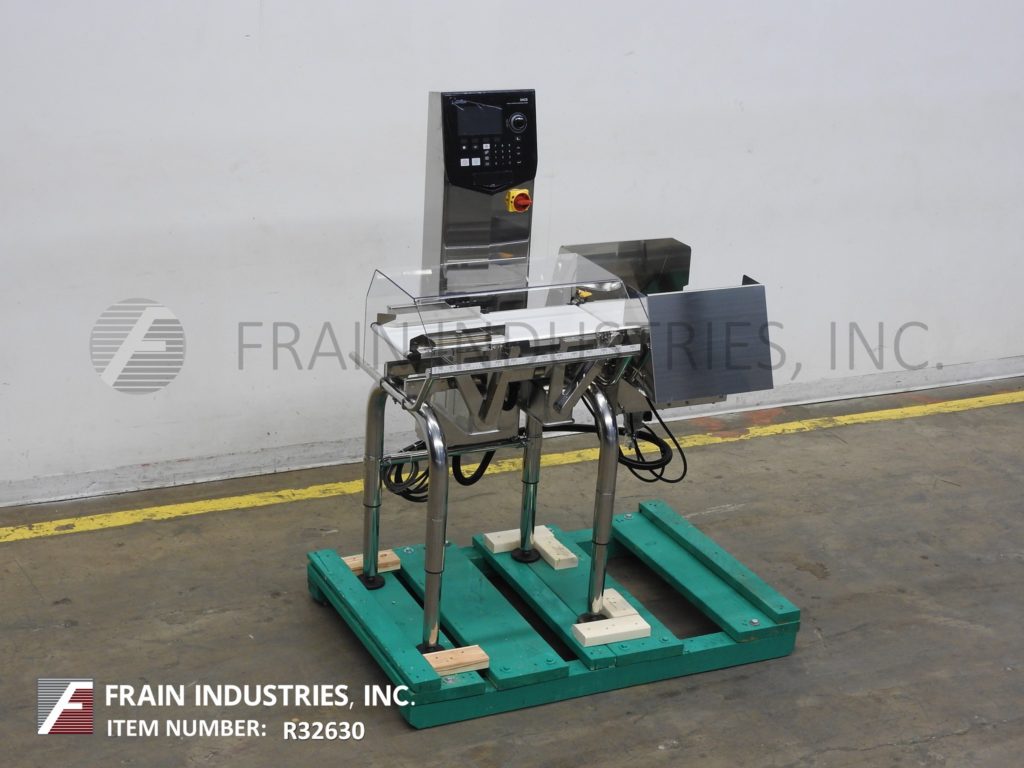 Ishida, Model DACS-GN-S015-SS-1, automatic, (3) zone, 304 stainless steel checkweigher. Rated up to 300 feet per minute with number of product – depending on materials and application. Load cell: 14" in Length; 9.5" in Width. Weight range: 6 to 1,500 grams with Accuracy: +/- 0.1 grams with accuracies dependant on materials, application, machine configuration and environment being run in. Equipped with 13.8" long x 9.5" wide neoprene in feed conveyor, stainless steel guide rails, 13.8" long x 9.5" wide neoprene weighing conveyor, 17.7" long x 9.5" wide neoprene discharge conveyor with dual air blast rejects ( one over / one under). Control panel with touch pad operator interface has 7" full color LCD display with 300 "preset" product programs, SUSB memory stick with X-bar charts and histogram and RS232 serial output of raw weight data. Mounted on (4) height adjustable legs.