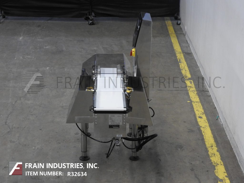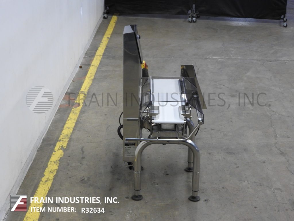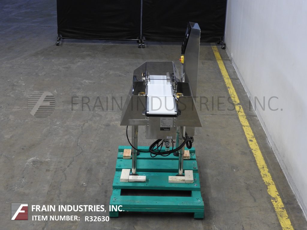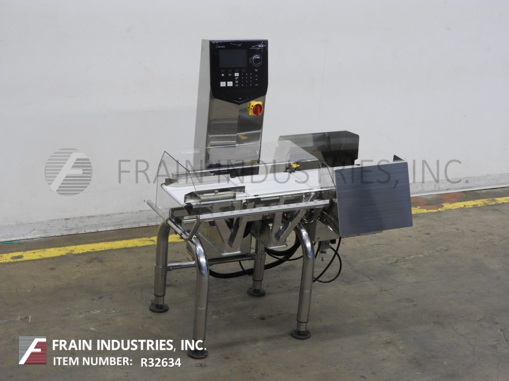 Ishida, Model DACS-GN-S015-SS-1, automatic, (3) zone, 304 stainless steel checkweigher. Rated up to 300 feet per minute with number of product – depending on materials and application. Load cell: 14" in Length; 9.5" in Width. Weight range: 6 to 1,500 grams with Accuracy: +/- 0.1 grams with accuracies dependant on materials, application, machine configuration and environment being run in. Equipped with 13.8" long x 9.5" wide neoprene in feed conveyor, stainless steel guide rails, 13.8" long x 9.5" wide neoprene weighing conveyor, 17.7" long x 9.5" wide neoprene discharge conveyor with dual air blast rejects ( one over / one under). Control panel with touch pad operator interface has 7" full color LCD display with 300 "preset" product programs, SUSB memory stick with X-bar charts and histogram and RS232 serial output of raw weight data. Mounted on (4) height adjustable legs.