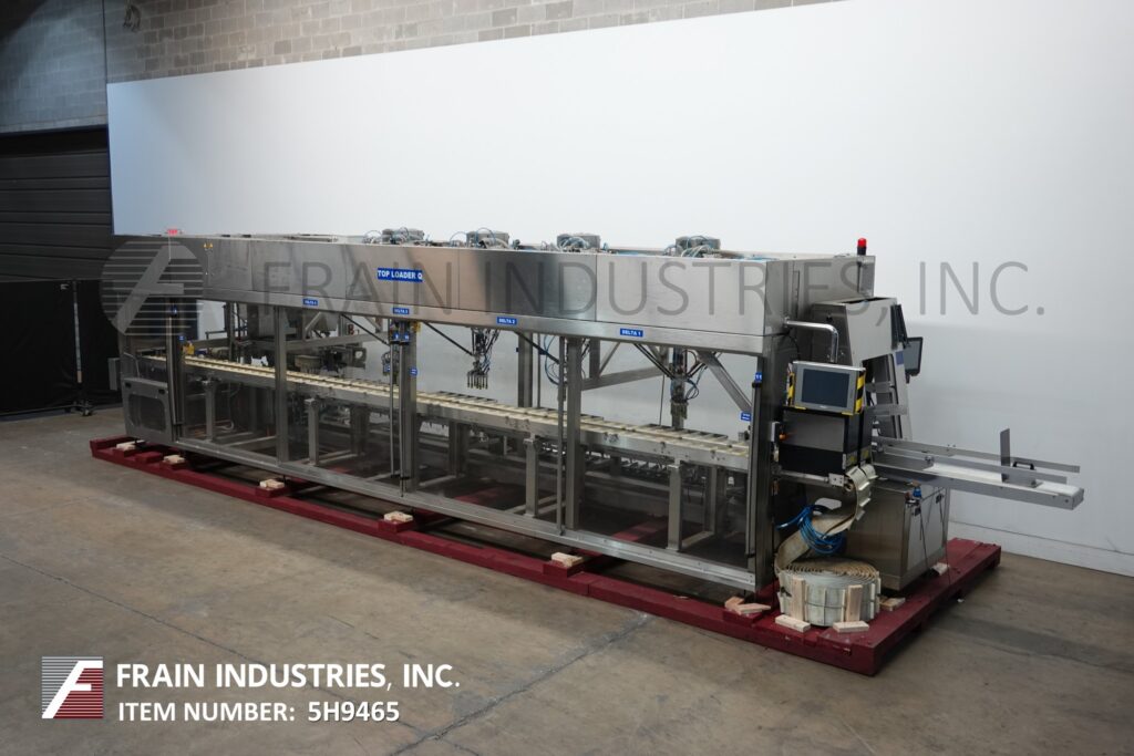 IXAPACK, Model D4000, TOPLOAD L2, Automatic, stainless steel, 4-head robotic, top pick n place, carton loader, turner and sealer rated up to 70 cartons per minute – depending on materials, application and pack pattern. Blank size range: 8" to 28" in width x 12" to 12" in height. Erected carton size range: 2,4" to 12" in width x 4.8" to 16" in height. Equipped with 354" long x 6" wide dual fixed product in feed conveyors set on 12" centers and 1-1/2" high cleats, with 354" long x 12" wide empty case (2) chain fixed empty case conveyor set on 12" centers with 1-1/4" wide x 1-1/2" height lugs, (4) Delta (8) suction cup, servo driven, robotic pick and place heads which pick the product from the conveyors to the empty cartons with (15) load stations and carton gluing section with 60" long x 5" wide discharge belt. Control panel has PLC controller with 19" PC HMI and machine start, reset and e-stop push buttons. Mounted on heavy duty frame with interlock safety door guarding and protection roof for dust control with statis light bar.