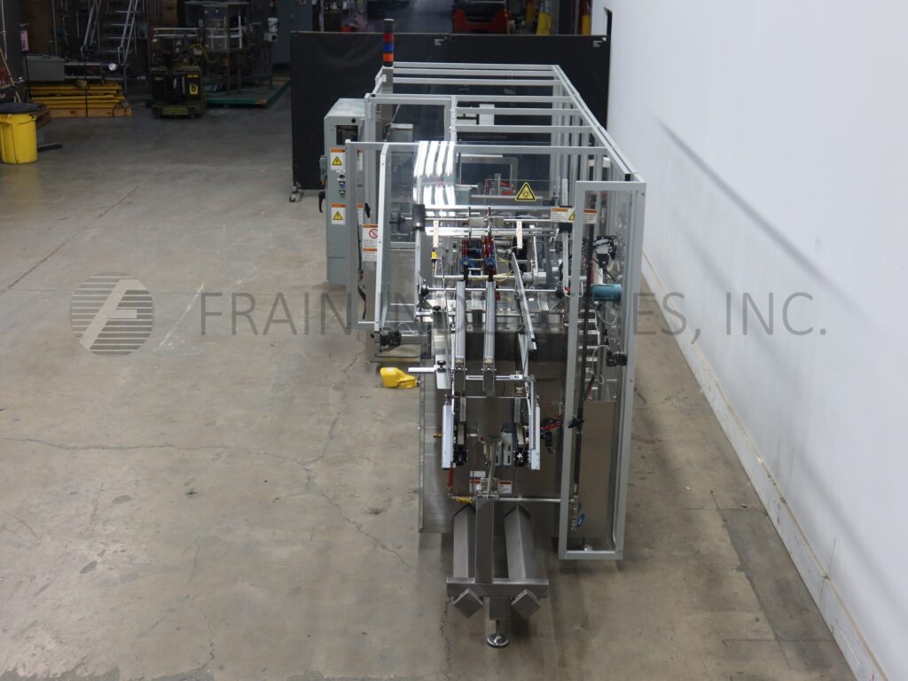 Jones, Model IMV5, Semi-automatic, vertical, tuck, cartoner. Rated from 10 to 45 cartoners per minute – depending on materials, applicationand operator dexterity. Carton size range: 1" to 4" in length, ¾" to 2¾" in width, 1¾" to 7" in depth. Equipped with 2-chains with 5" centers, 4¼" long lugs, 26" long vibratory blank magazine, 4-cup reciprocating vacuum blank pick-off, (2) 48" long load station and cam driven right angle carton discharge. Control panel with AB controller and touch screen HMI.