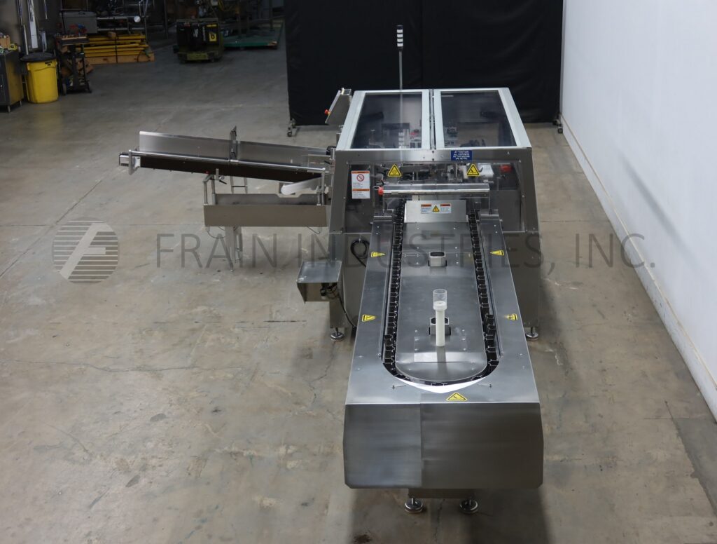 Jones, model L200HL, semi-automatic, continous, or intermittent motion, horizontal cartoner capable of speeds up to 80 cpm depending on application. 4 chain adjustable unit is set on 12" centers with 4" high lugs. Carton size range of: 4" – 11½" long x 1" – 10½" wide x 5¾" – 12" deep. All stainless steel contruction, with 60" L x 20" W back pressure control blank carton magazine, 3 head rotary vacuum carton pic-n-place, 50" long product hand load area, Nordson H/M, 34" discharge height, complete interlock barrier saftey guarding.