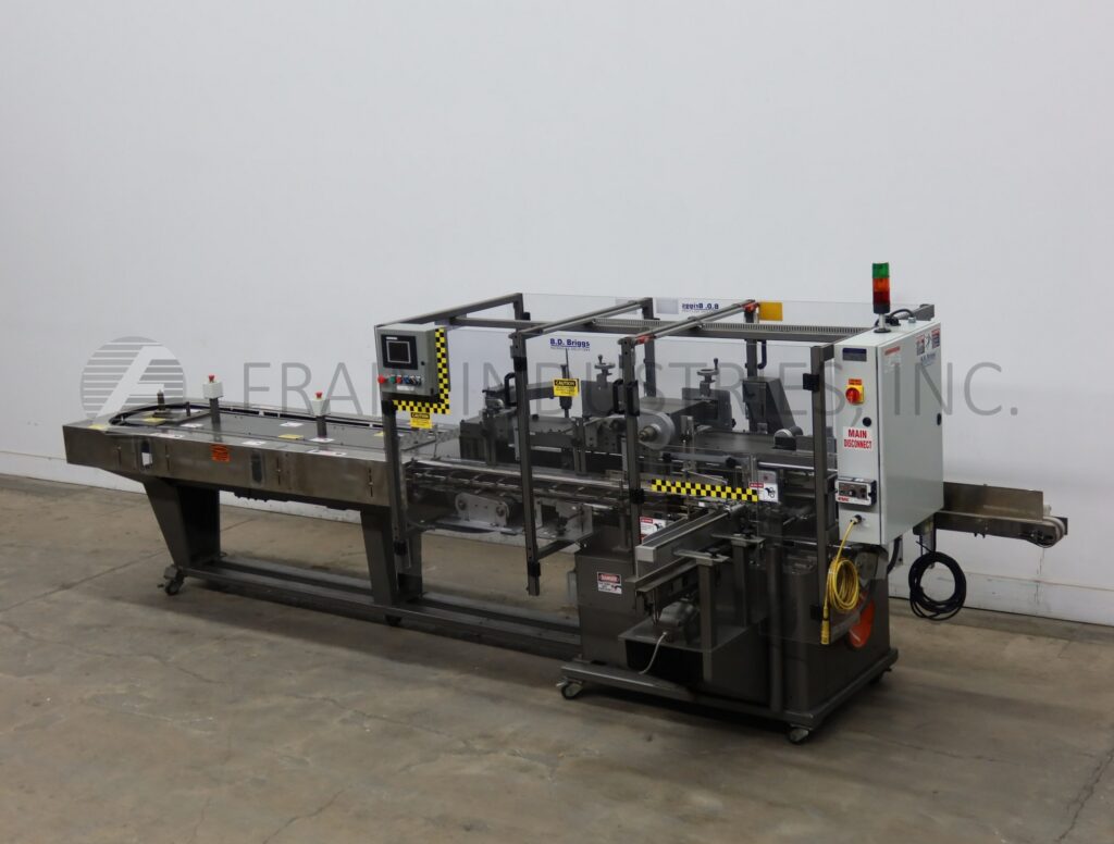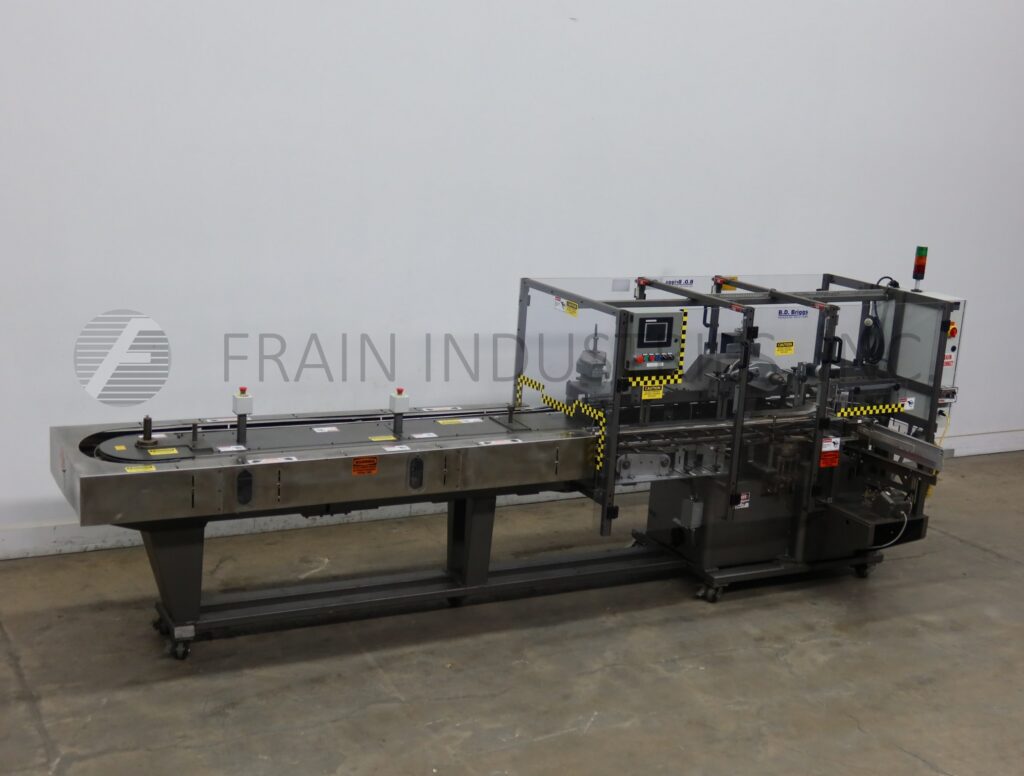 Jones, Model CMV5, Semi automatic, continuous motion, vertical, tuck cartoner, rated from 40 to 120 cartons per minute – depending on materials and application and operator dexterity. Carton size range: 1" to 4¼" in Length x ¾" to 4½" in Width x 2½" to 9" in Depth. Equipped with (3) chains adjustable set on 5" centers, with 29" long blank carton magazine with vibratory feeder and carton pusher, reciprocating single head suction cup pick-n-place, 96" long load area each side with major and minor flap closers and tuckers with 96" long x 4" wide discharge conveyor belt. Control panel has PLS controller with control power and carton feed on / off switches, start, stop push buttons with e-stop. Mounted on heavy duty frame with safety guarding and statis light.