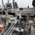 Jones, Model CMV5, semi automatic, continous motion, vertical tuck cartoner,rated from 40 to 120 cartons per minute – depending on materials, application and operator dexterity. Carton size range: 1" to 4¼" in Length x ¾" to 4" in Width x 2½" to 9" in Depth. Equipped with (3) chains adjustable set on 5" centers, 30" long blank carton magazine with recipicating suction cup pick-n-place, 120" long operator load areas (one each side of machine) and 45" long x 5" wide carton discharge conveyor. Control panel has Moeller PLC, on / off switches and push button start / stop. Mounted on heavy duty base frame.