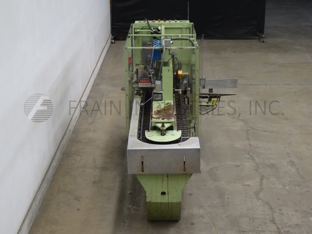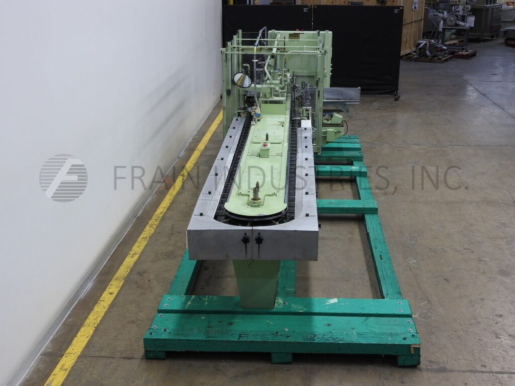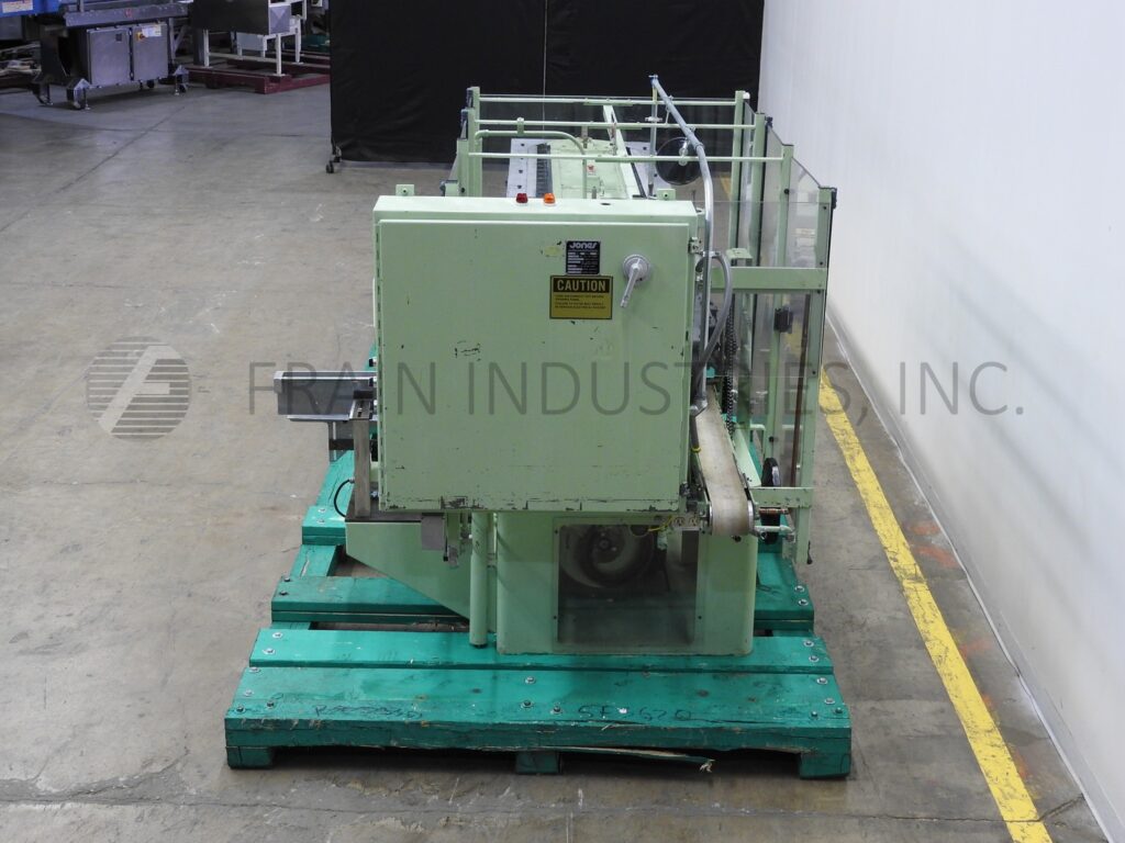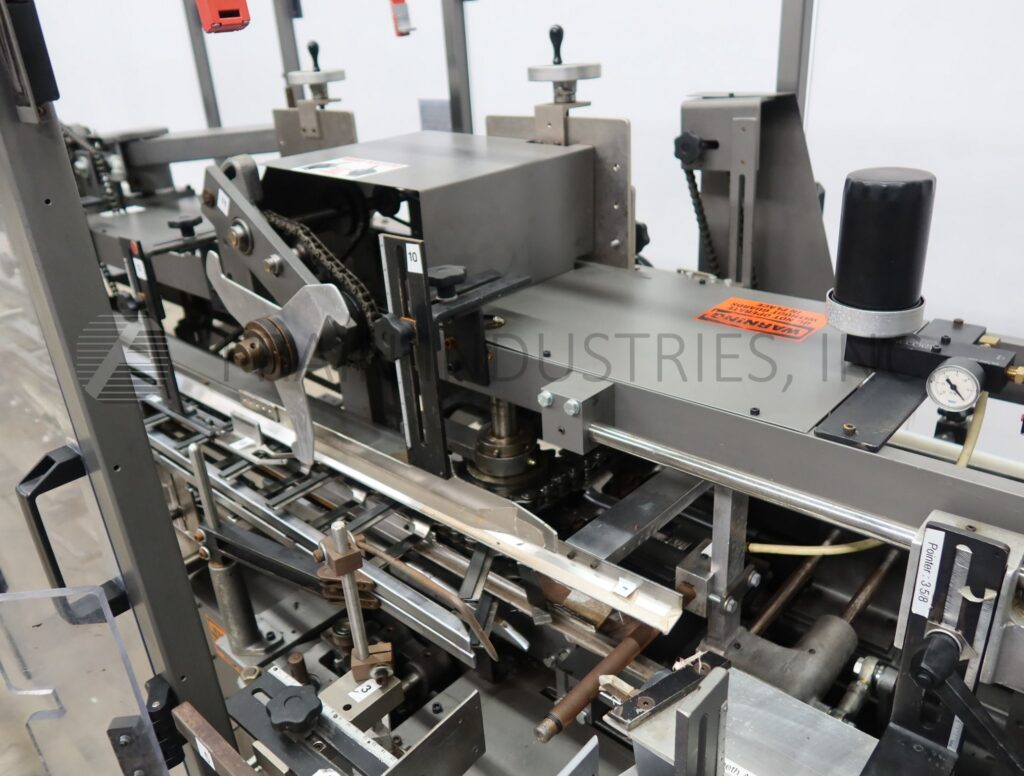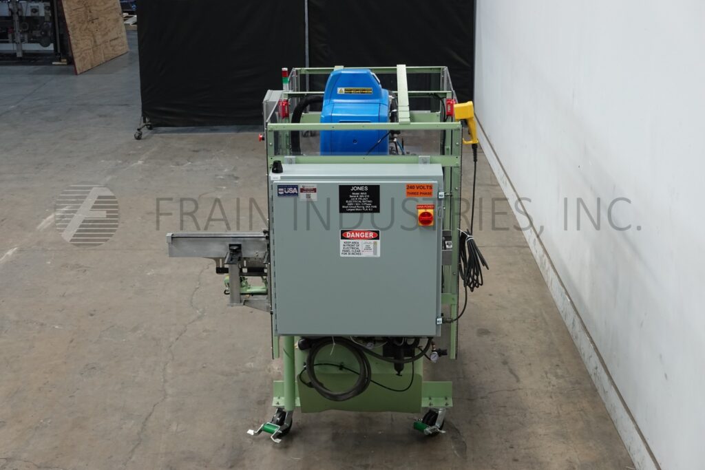 Jones, Model IMV 5, Semi-automatic, intermittent motion, vertical tuck cartoner. Rated from 10 to 45 cartons per minute – depending on materials, application, machine configuration and operator dexterity. Carton size range: 1" to 4" in Length; ¾" to 2¾" in Width; 2-1/8" to 7" in Depth. Equipped with (2) chains fixed, set on 5" centers, with 26" long blank carton magazine, reciprocating pic-n-place, 48" long operator load area each side, minor flap tuckers and major flap closers. Control panel has start / stop push button controls. Mounted on heavy duty frame with safety door guarding.